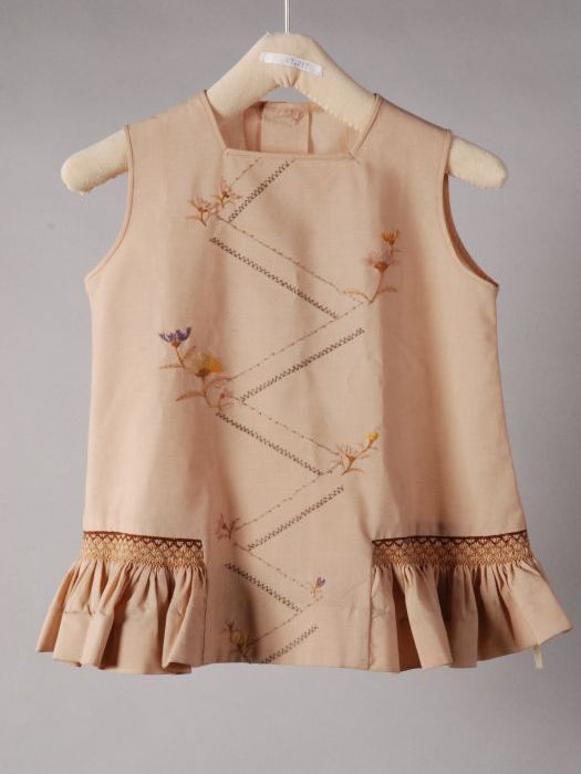 Mouwloze gerende kinderjurk van oudroze katoen, smok...
