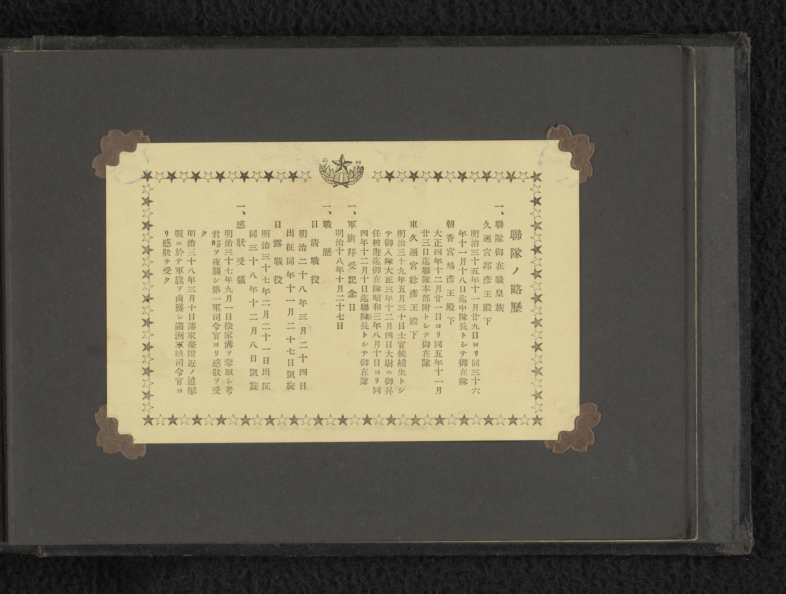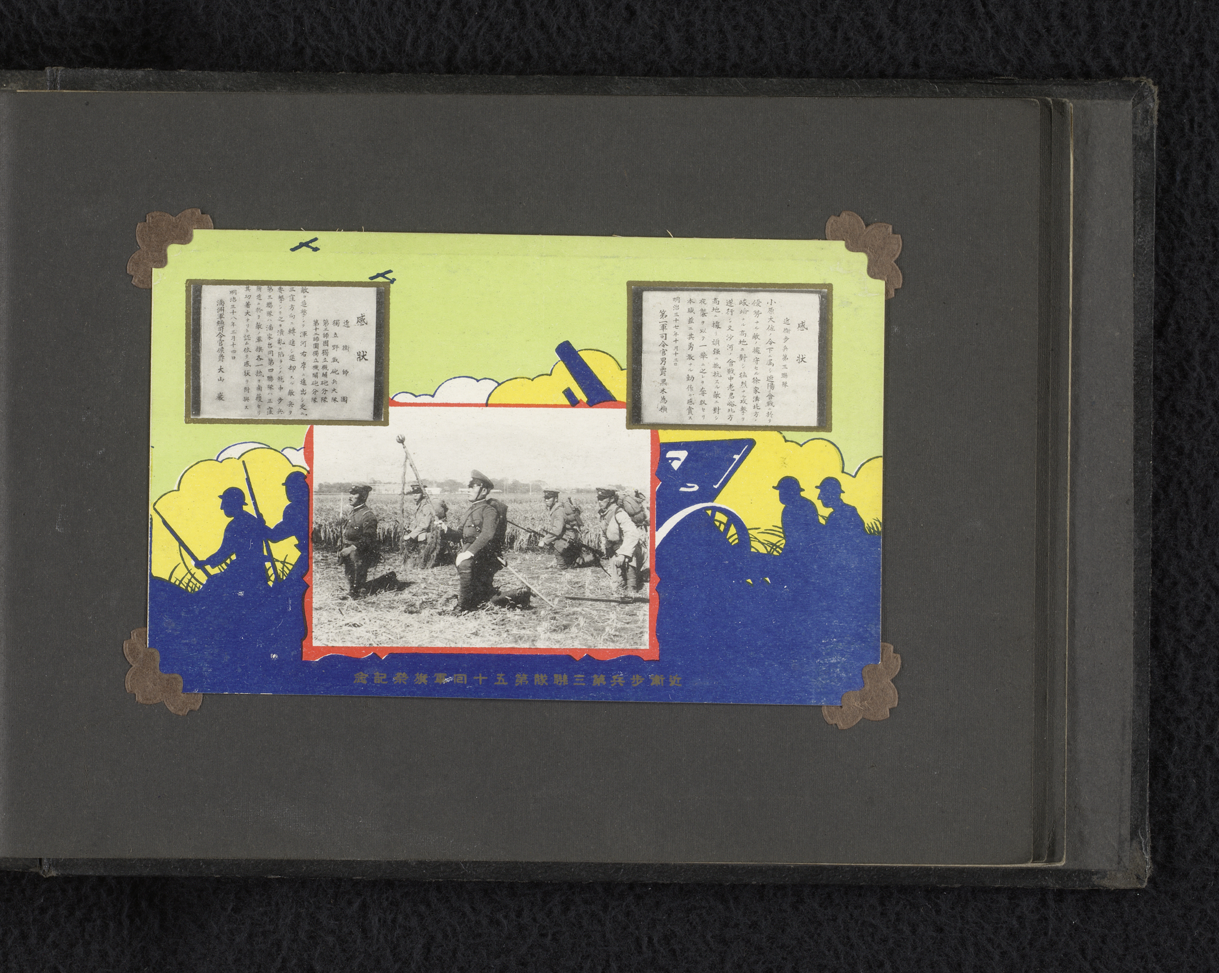 Twee documenten en soldaten in een veld, op de achte...