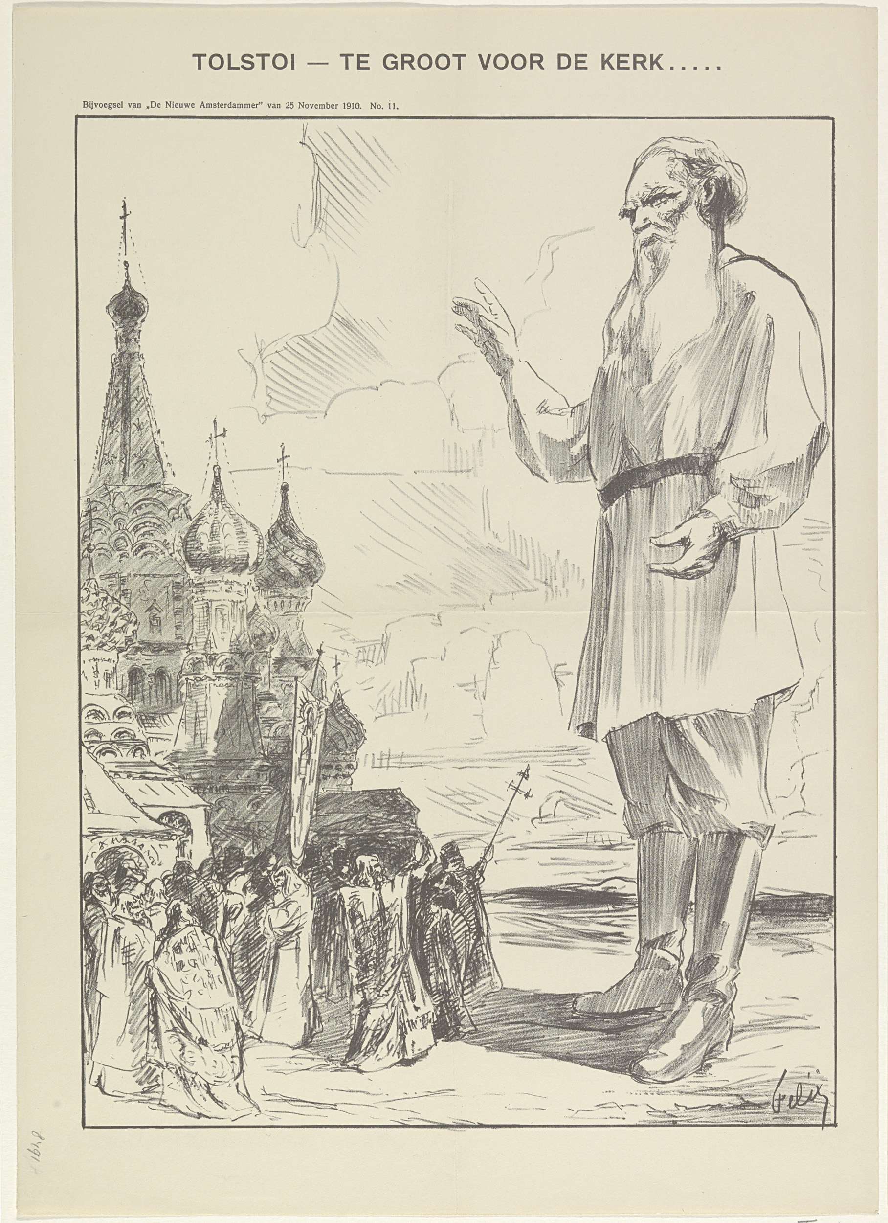 Spotprent met de Russische schrijver Tolstoj, 1910