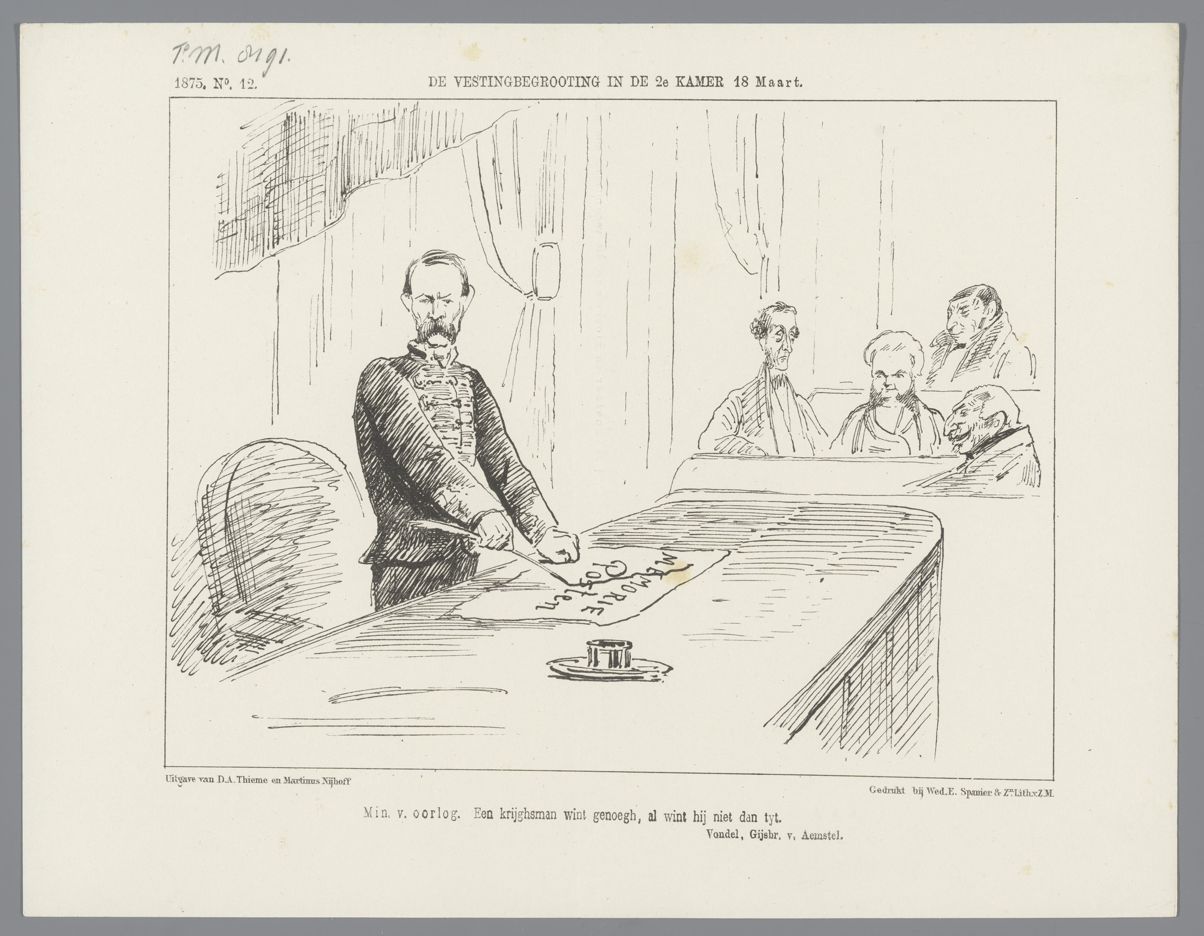 Spotprent op het debat rond het vestingstelsel, 1875