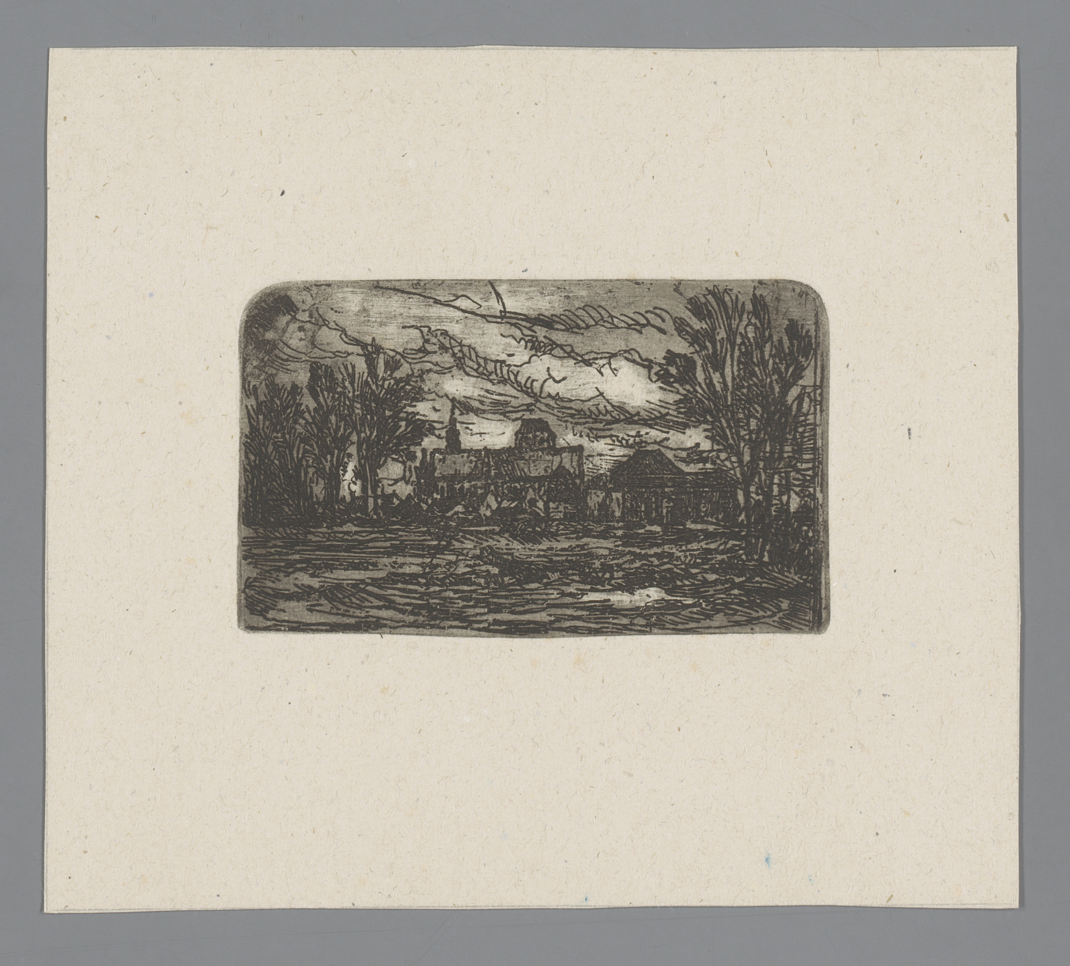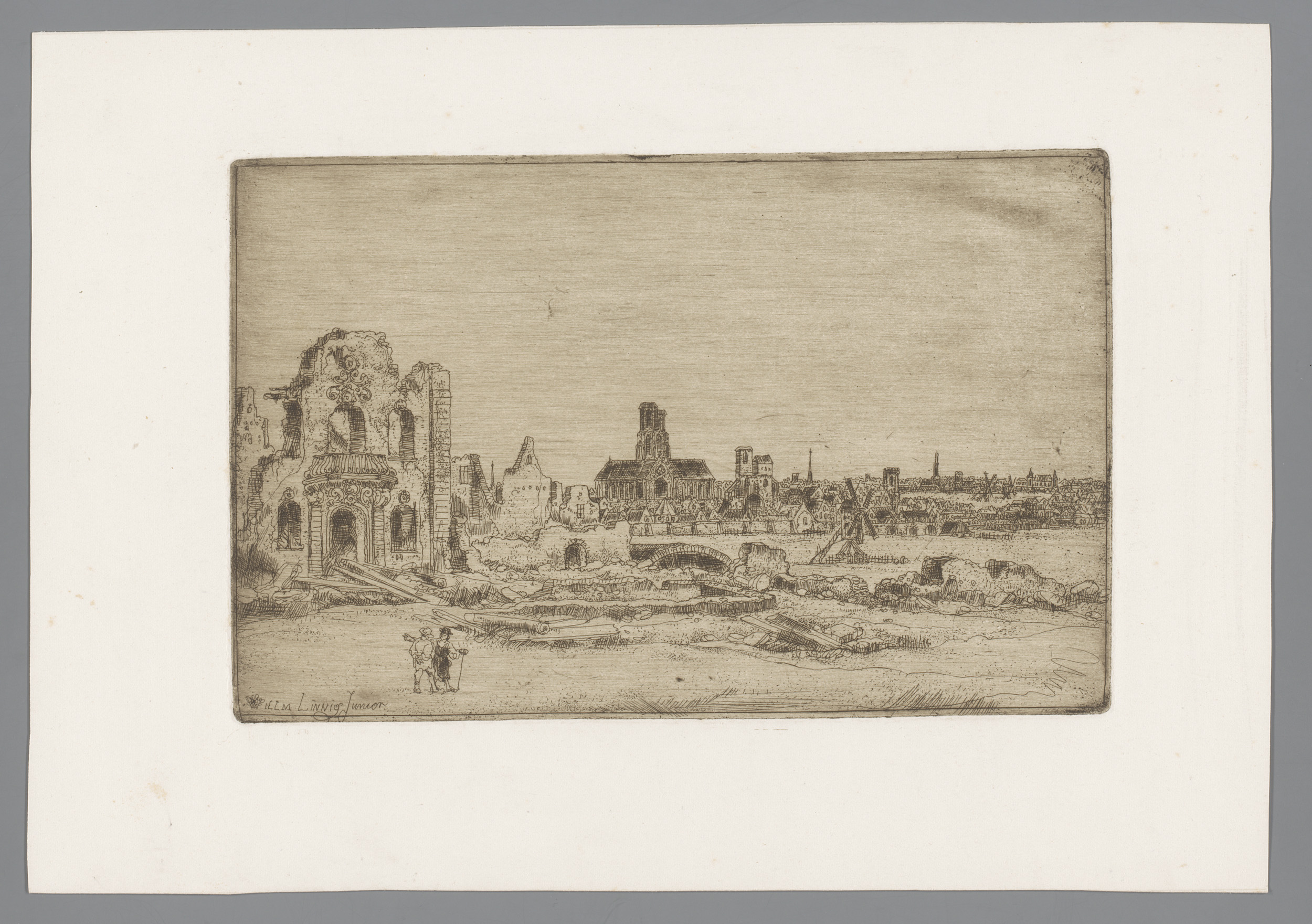 Stadsgezicht met een ruïne en twee figuren op de voo...