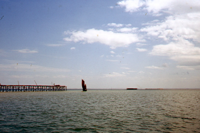 Kust van Zuid-Korea met pier en jonk.