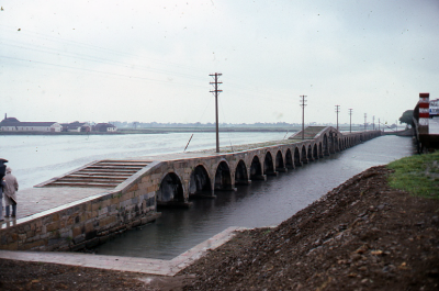Stenen dijk in Zuid-Korea. Op het water een bootje.