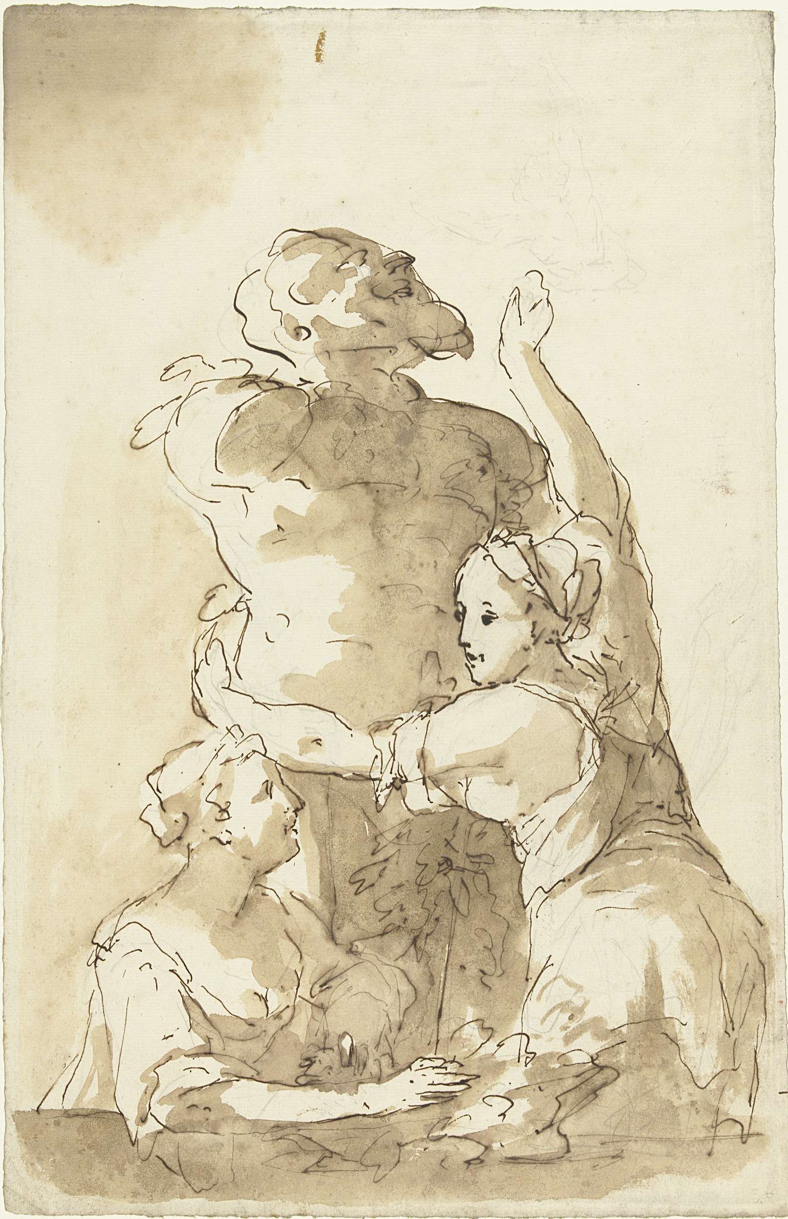 Twee vrouwen, waarvan één een mansbeeld omhelst
