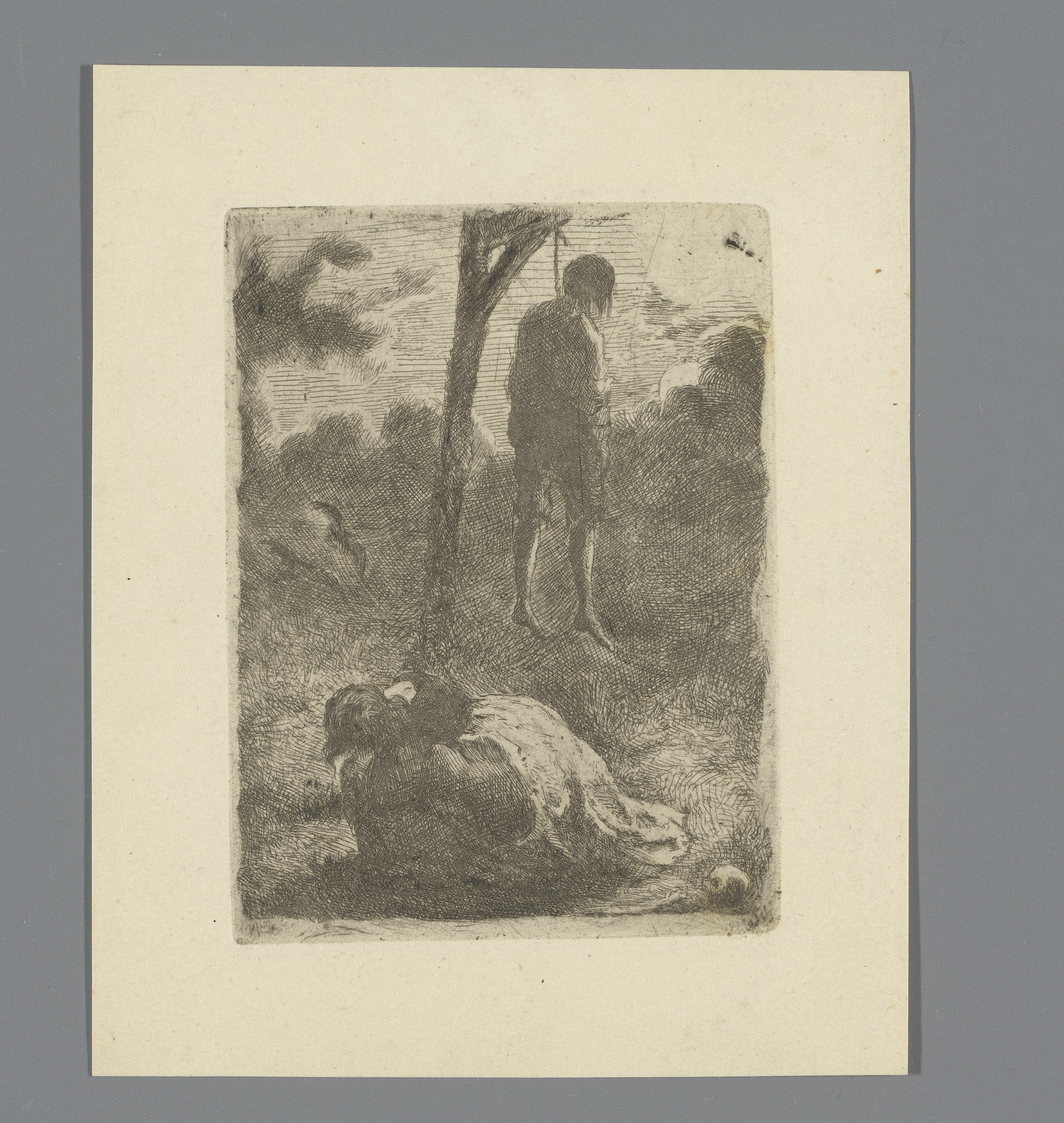 Rouwend persoon aan de voet van een galg met een geh...