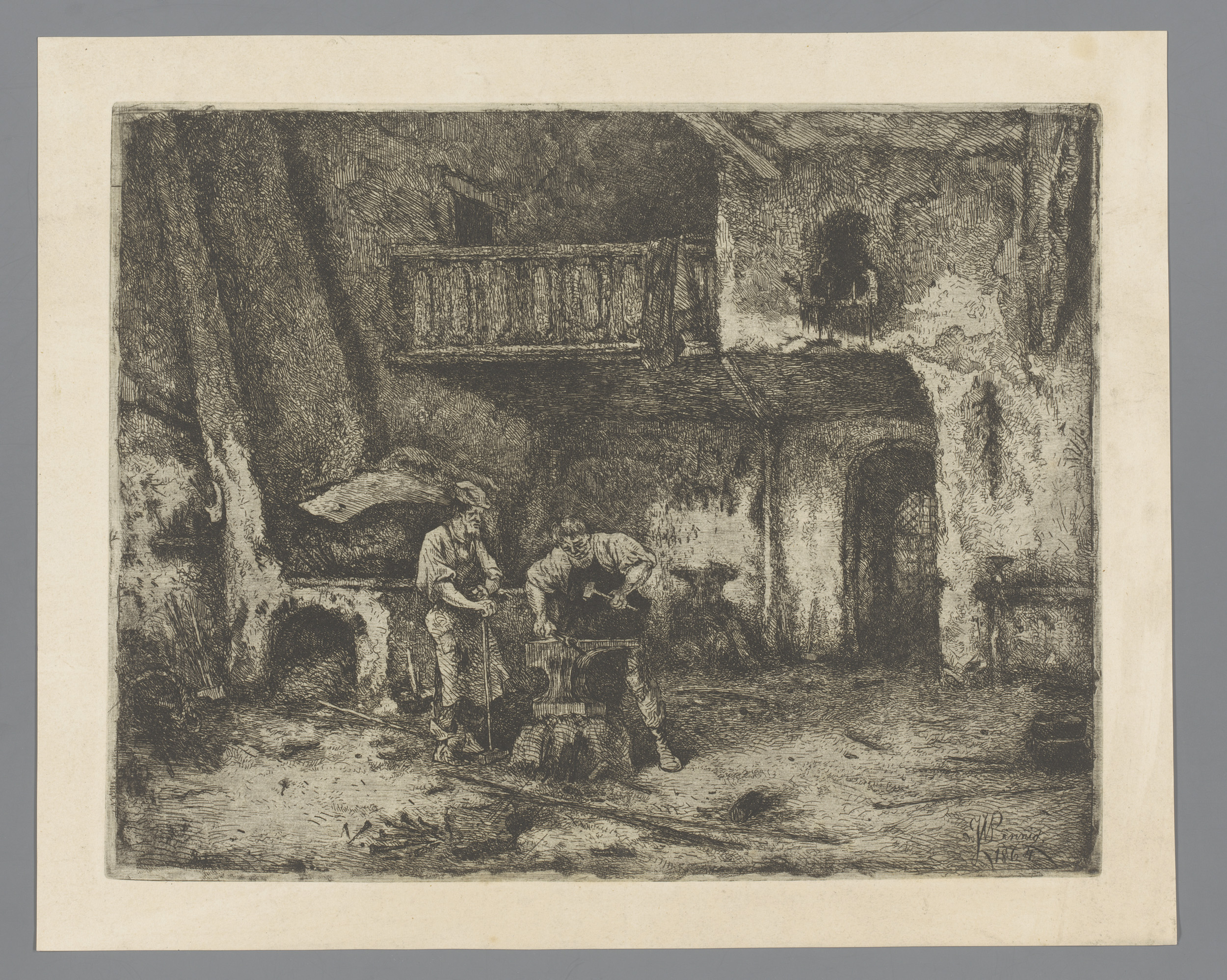 Twee mannen aan een aambeeld in de smidse