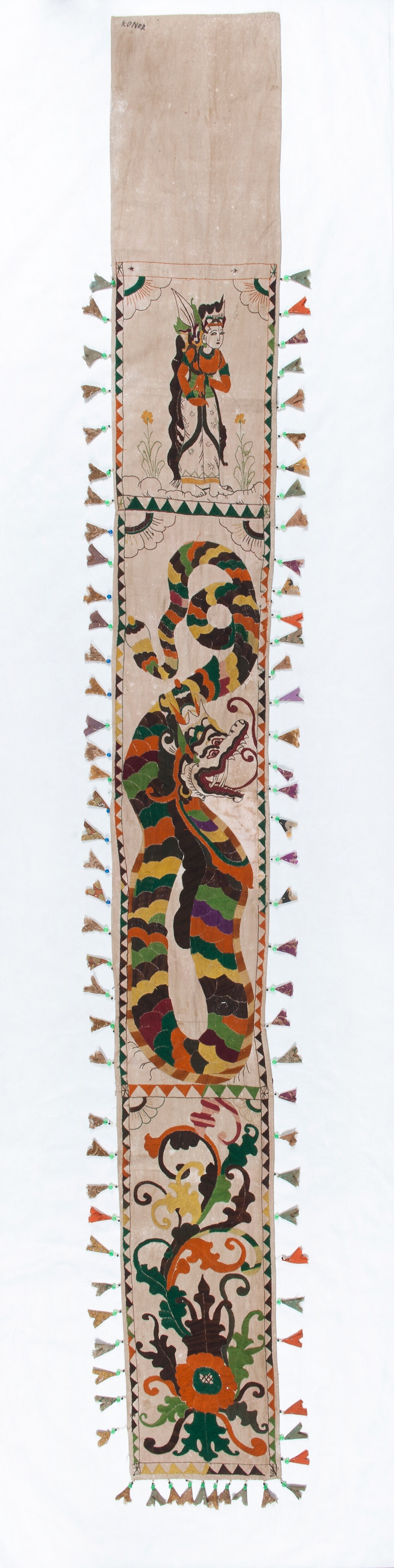 Tempelversiering met geborduurde figuren