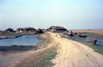 Dorpje en enkele bootjes in kustgebied in Bangladesh...