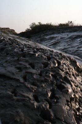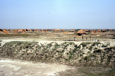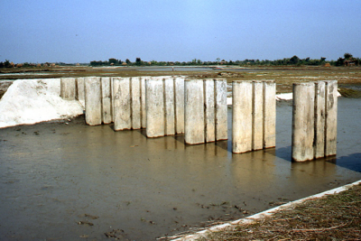 Dijk in kustgebied in Bangladesh, 1989. Op de achter...