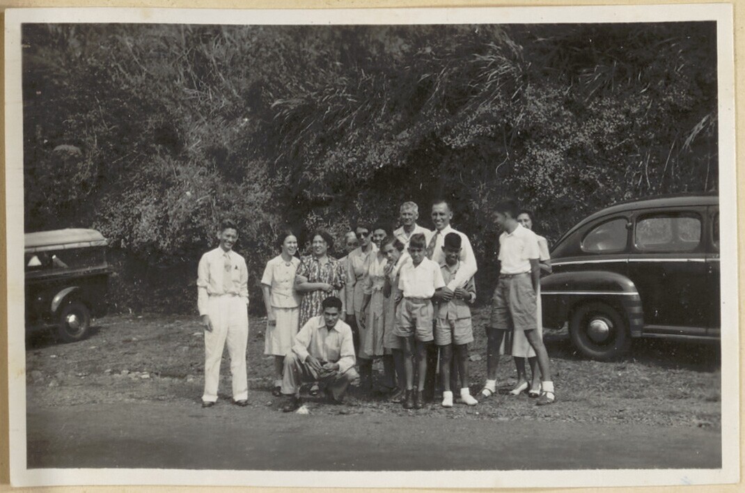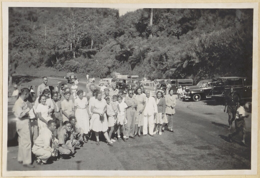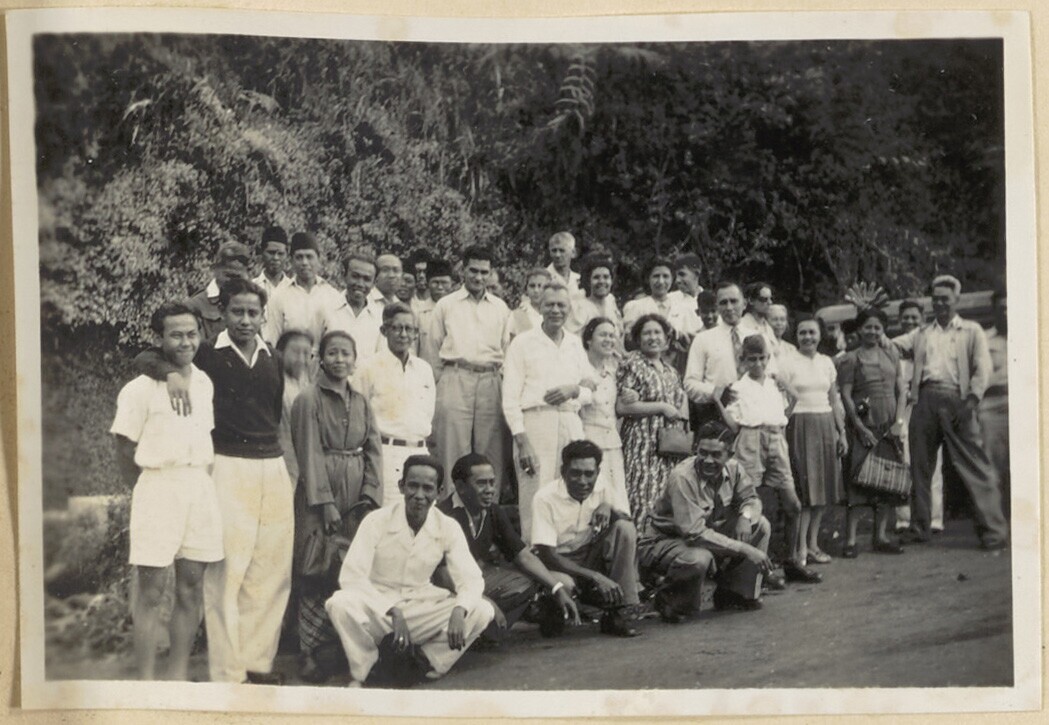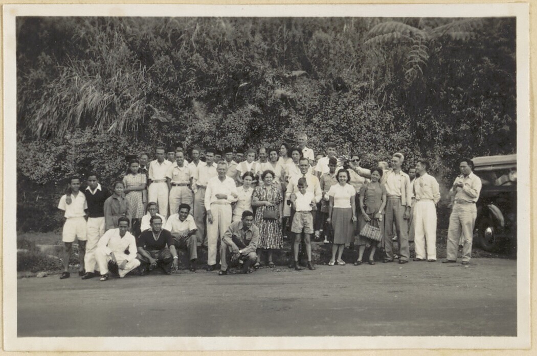 Groep Indo - Europese mensen op parkeerplaats bij de...