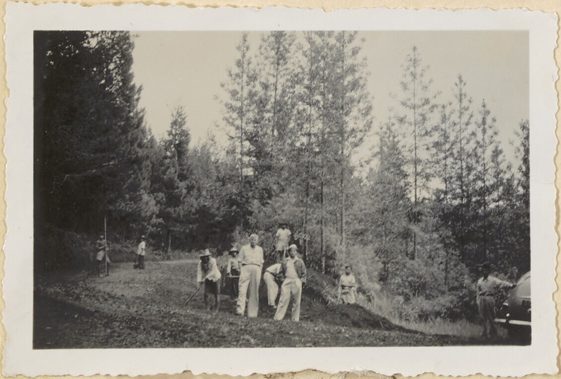 Javaanse arbeiders werken aan de weg in het bos