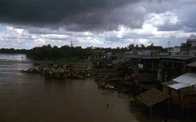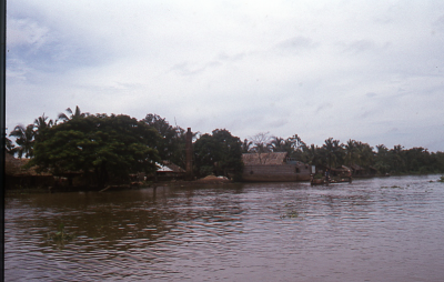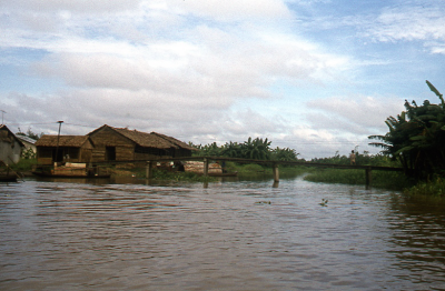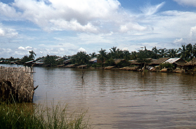 Rivier in de Mekongdelta in Vietnam. Bebouwing langs...