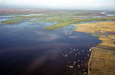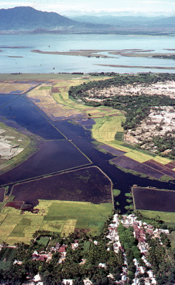 Dijk en visfuik in de Mekongdelta in Vietnam. Op de ...