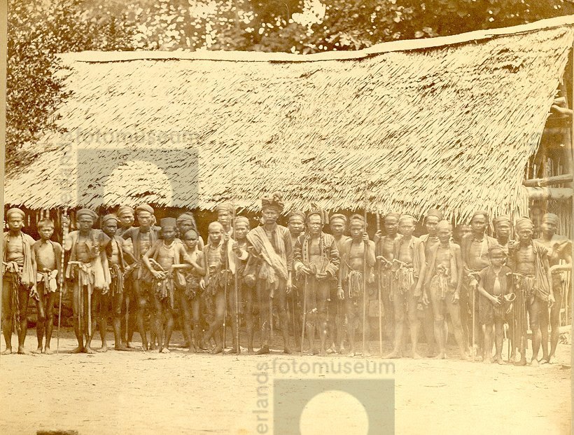 Niassers van Goenoeng Sitoli voor een grote hut