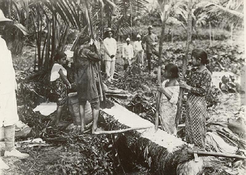Batak vrouwen bij het kloppen van sago, Sumatra, Ind...