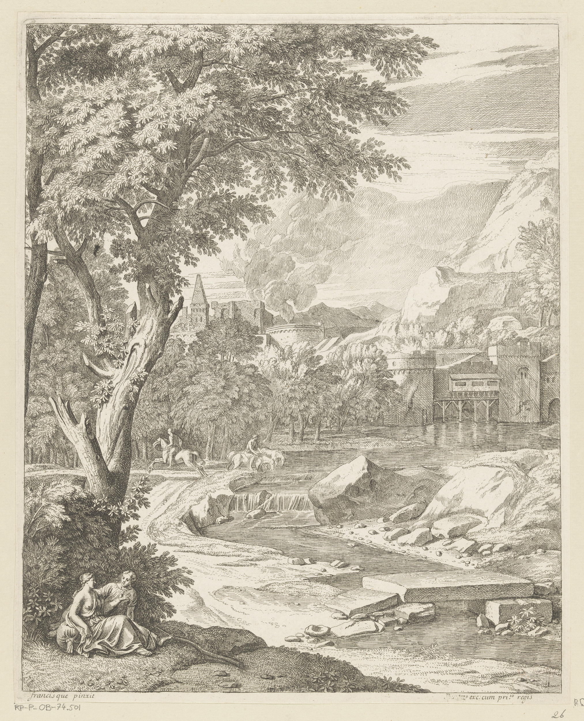 Arcadisch landschap met figuren bij een beek