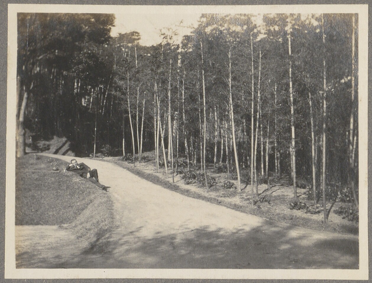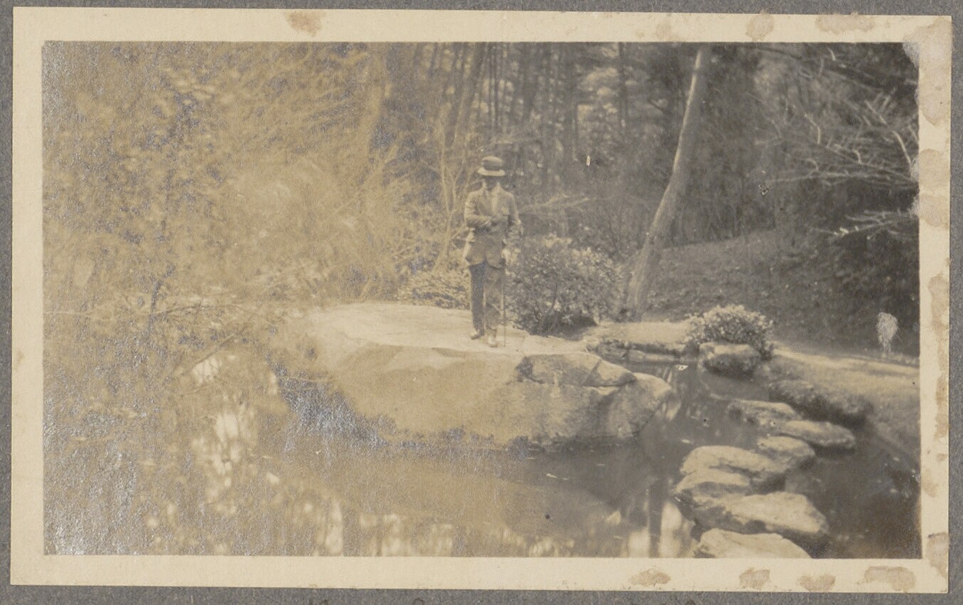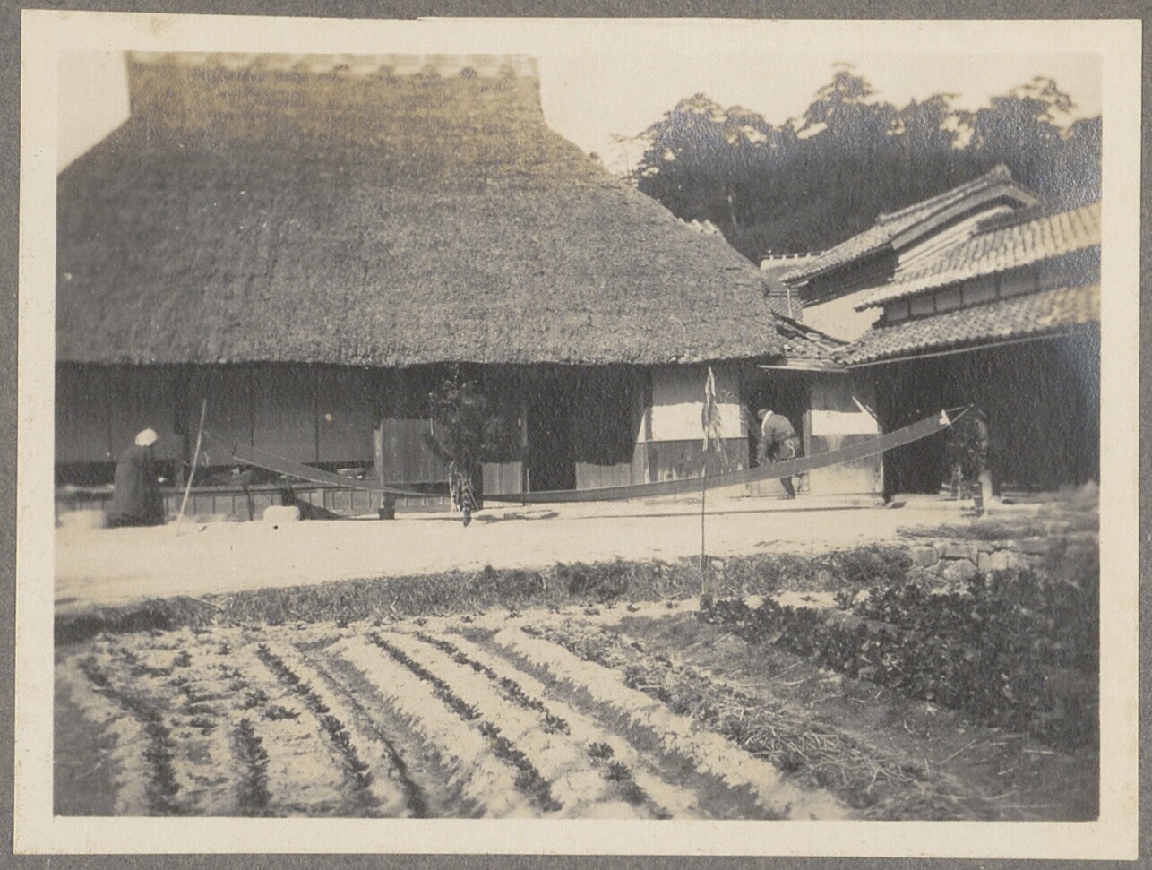 Twee mannen in een tuin voor een gebouw in Suma, Japan