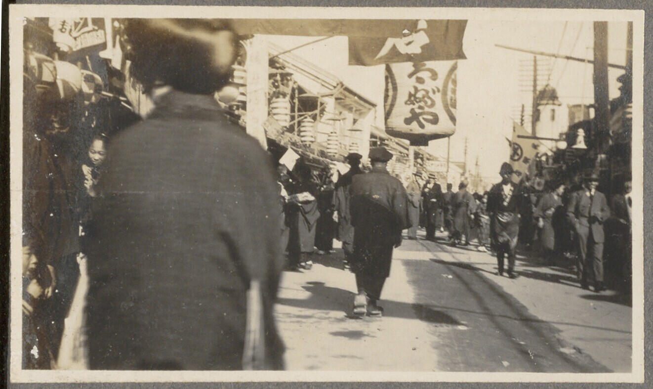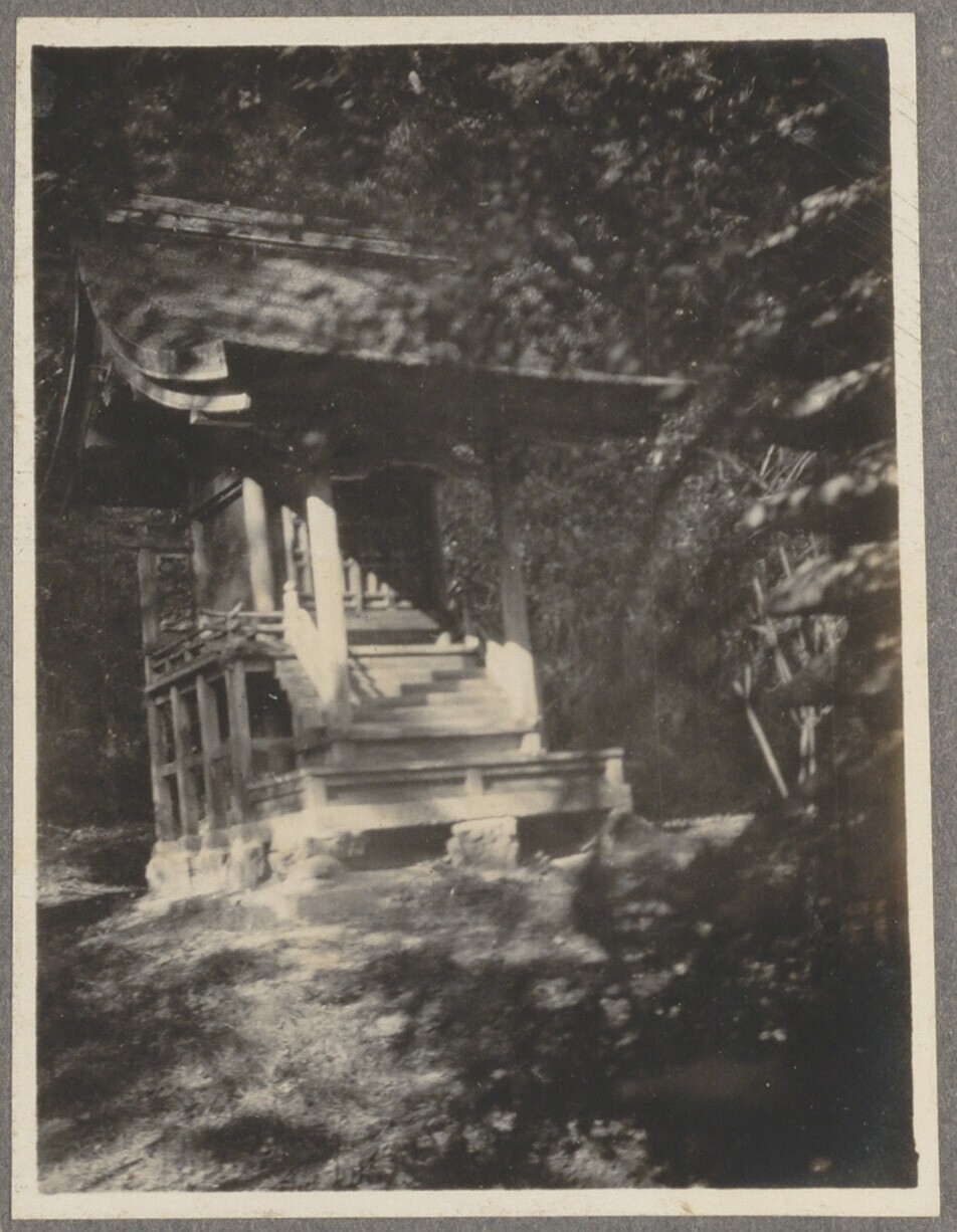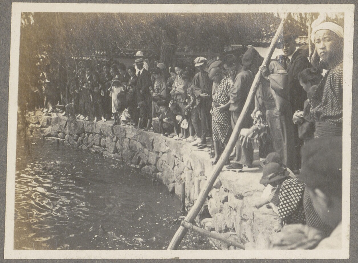 Twee mannen in een tuin voor een gebouw in Suma, Japan
