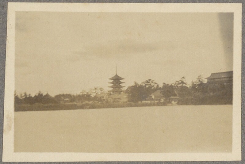 Gezicht op de stad Nara met tempel, op de voorgrond ...