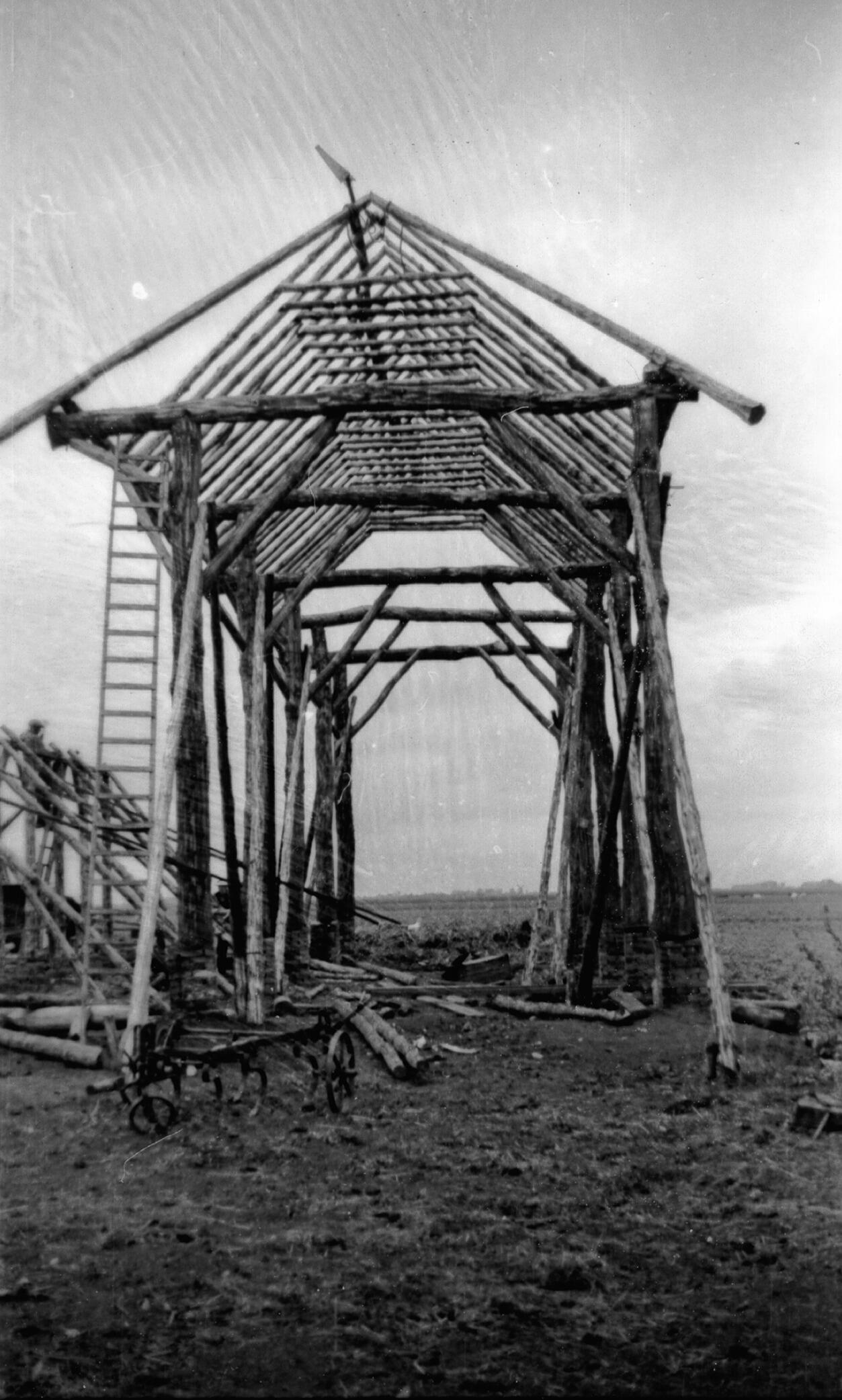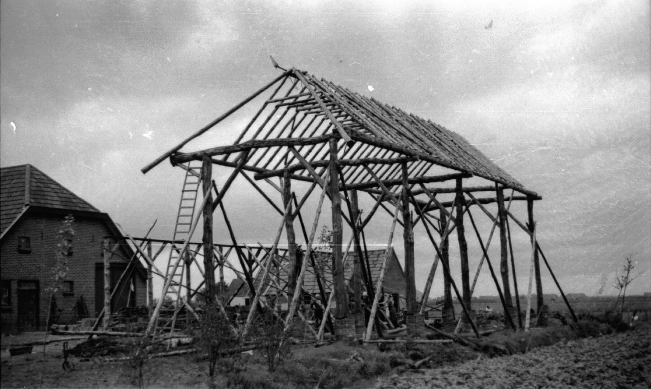 Schuur in aanbouw, Bourtange, 1938 (zwart-wit foto)
