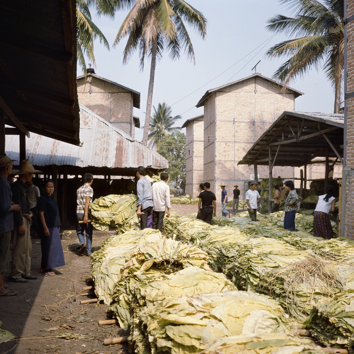 De geoogste tabaksbladeren woeden in eer loods gebra...