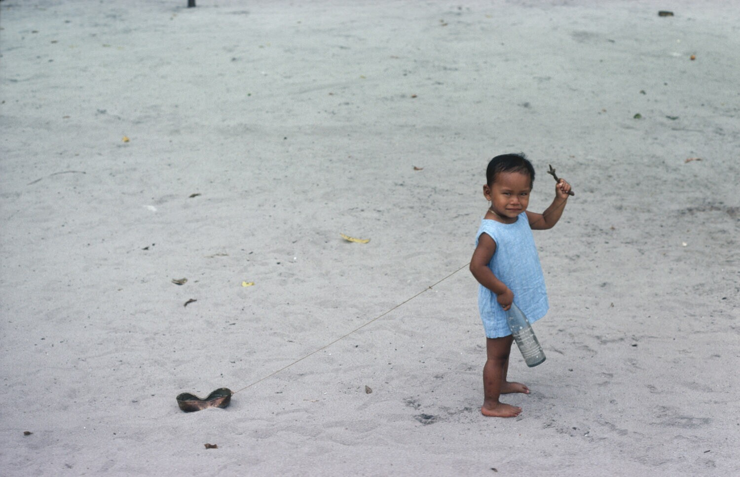 Meisje uit het dorp Powaka met eigengemaakt speelgoed