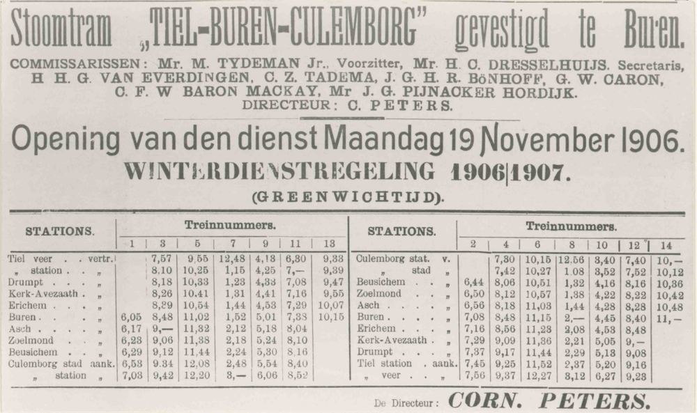 Foto, voorstellende dienstregeling stoomtram Tiel-Bu...