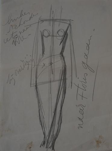Staande (constructieschets) met tekst.