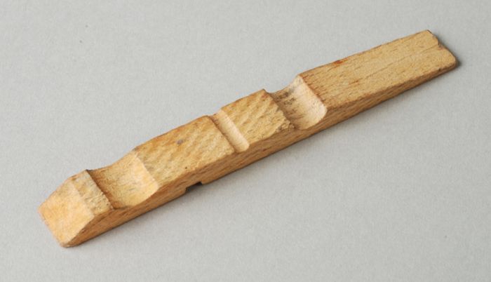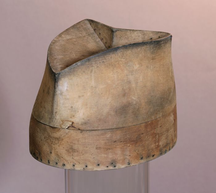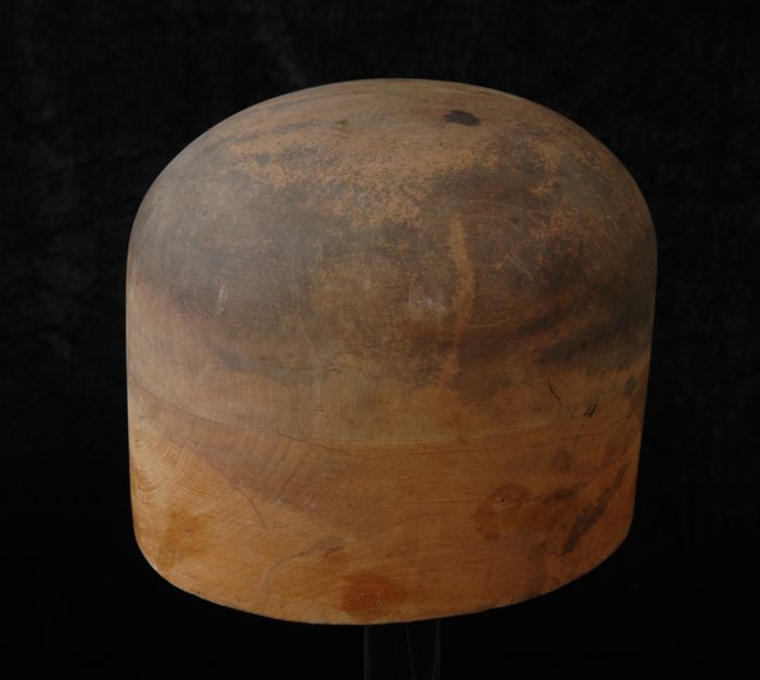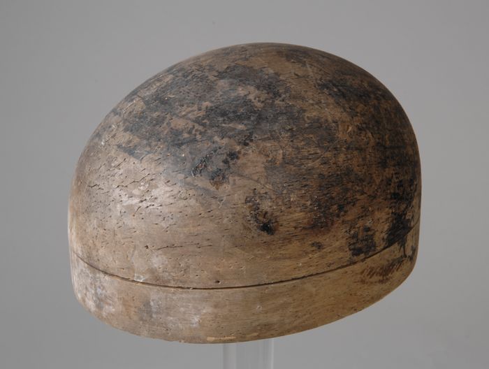 Hoedenmal van hout, onderzijde drie gaten, "281" en ...