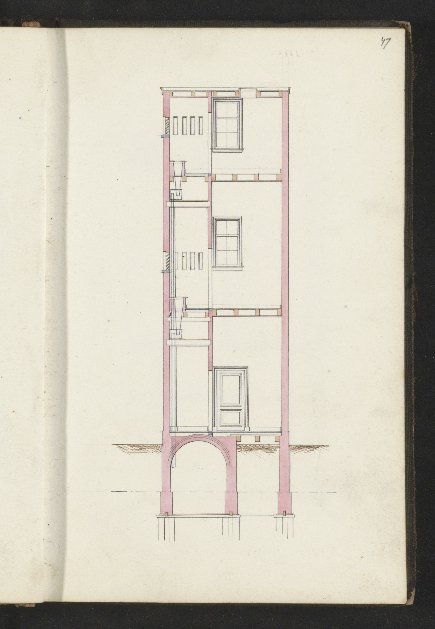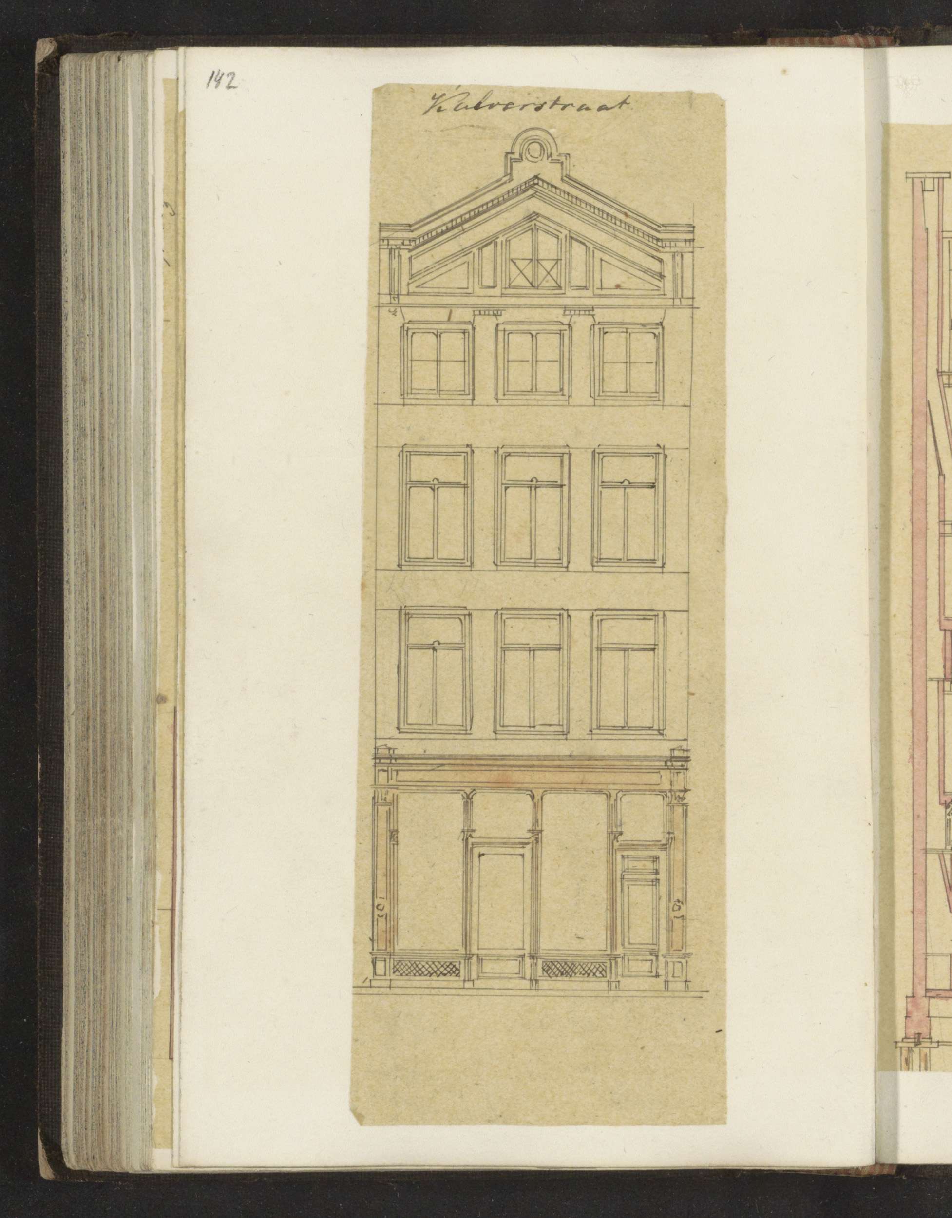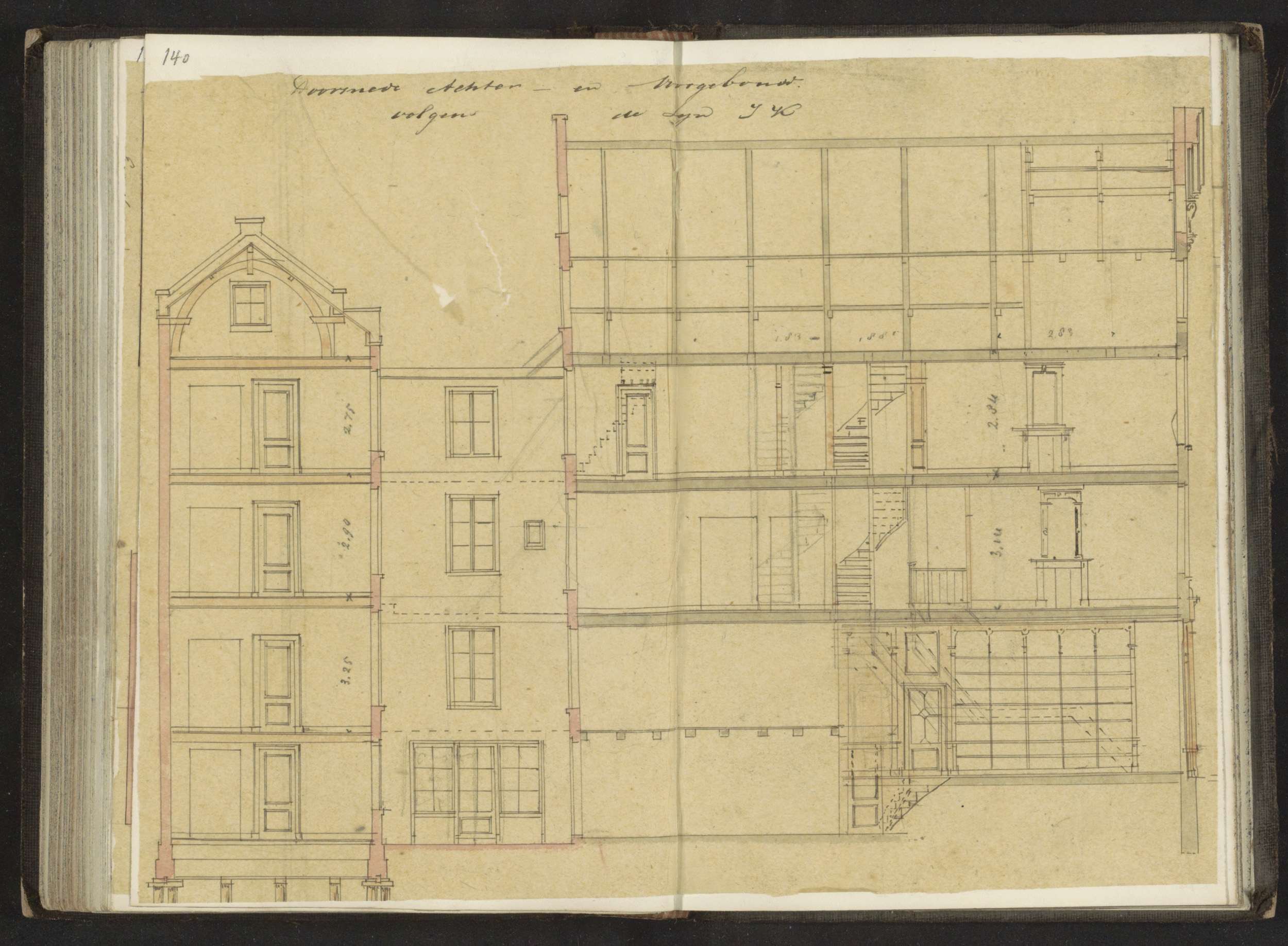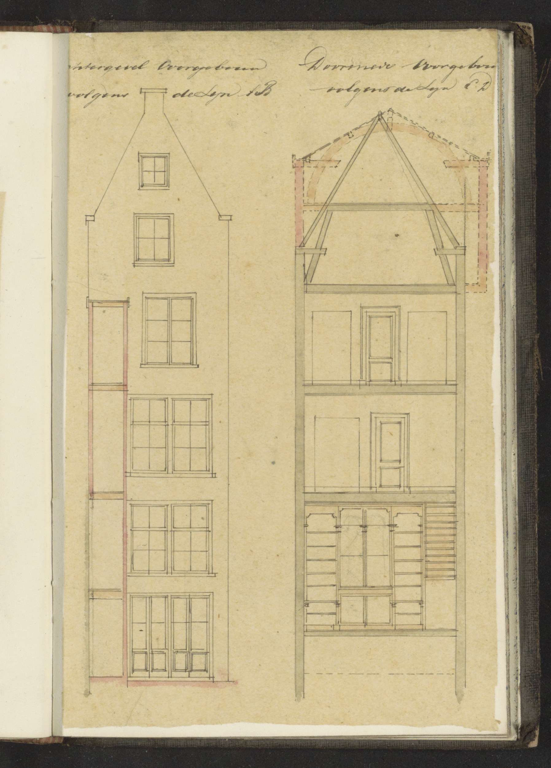 Opstand van een voorgevel en een dwarsdoorsnede van ...