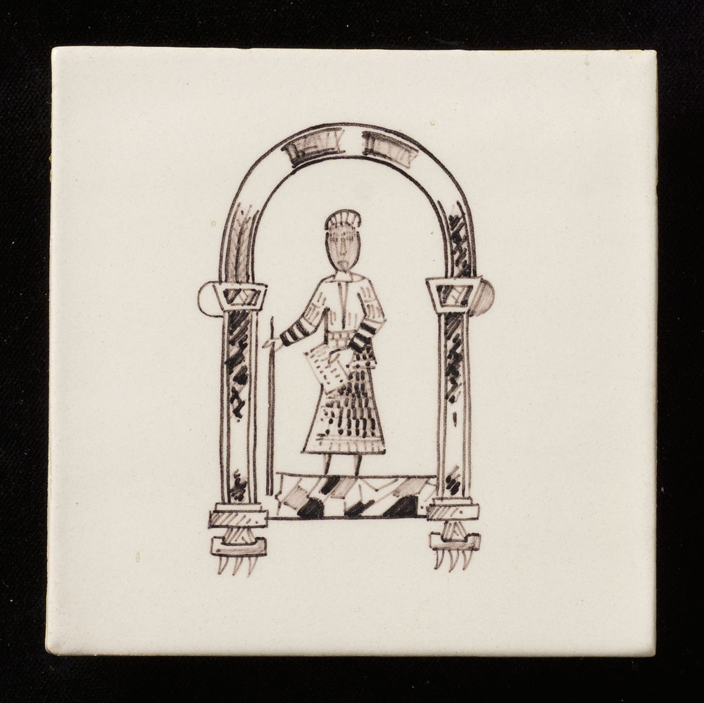 Tegel in tinglazuur, met voorstelling: figuur in poo...