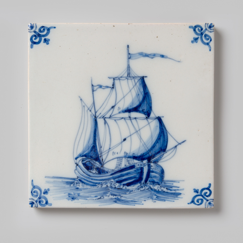 Tegel in tinglazuur, met voorstelling: Schip, vervaa...