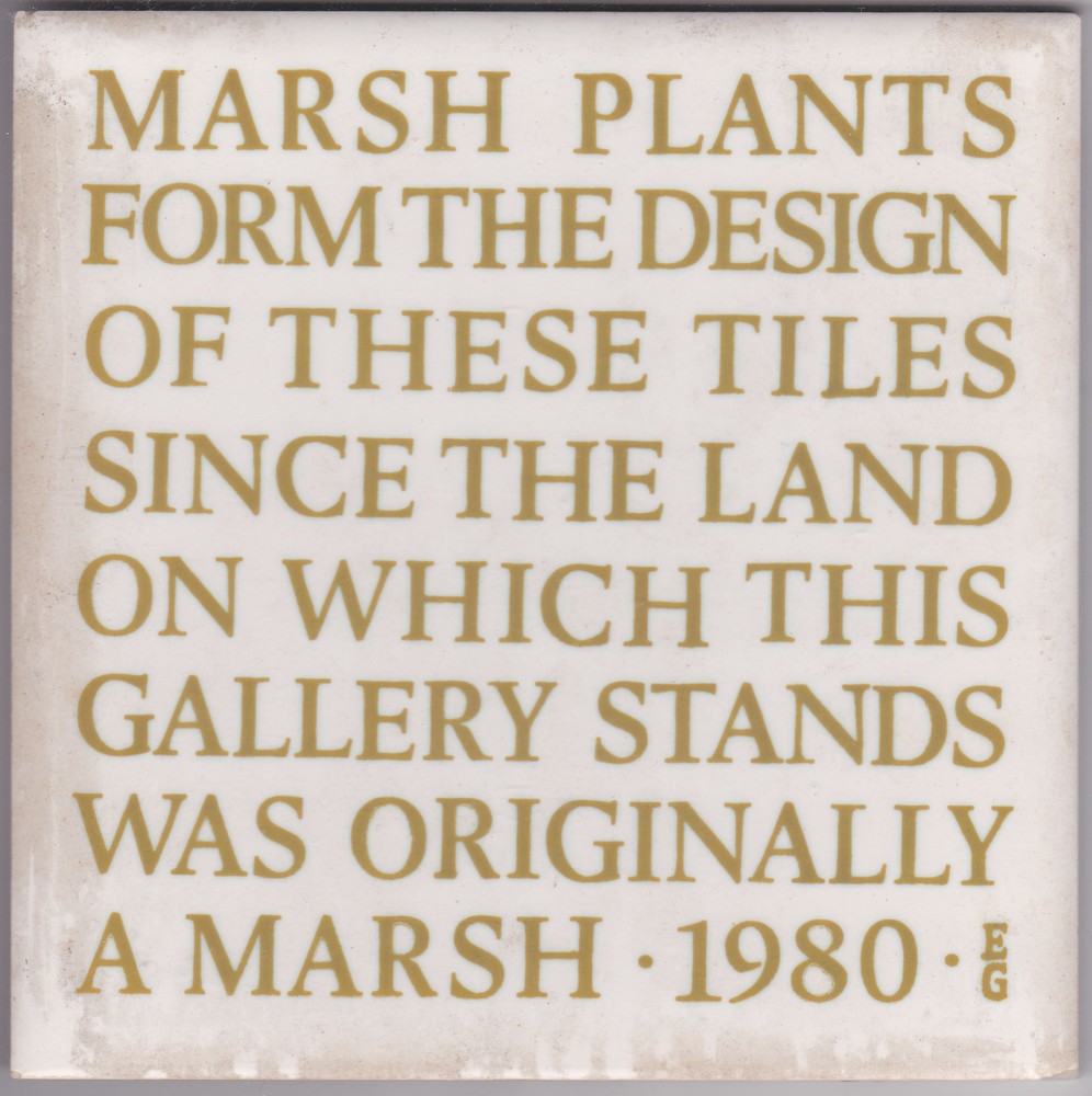 Tegel in zeefdruk, met voorstelling: tekst: Marsh pl...