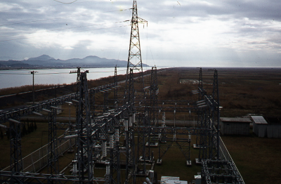 Elektriciteitsmast en spoelen in de polder Hachiroga...