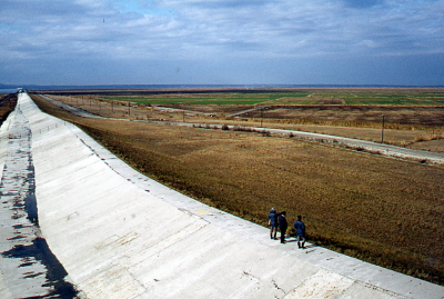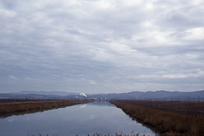 Kanaal in de polder Hachirogata in Japan.