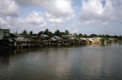 Dorp aan het water in de Mekongdelta in Vietnam, 1987.