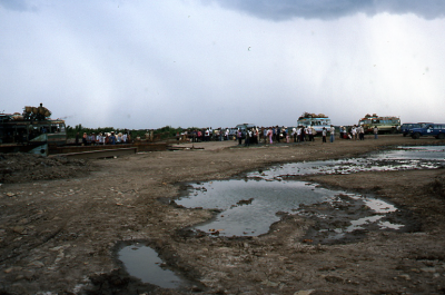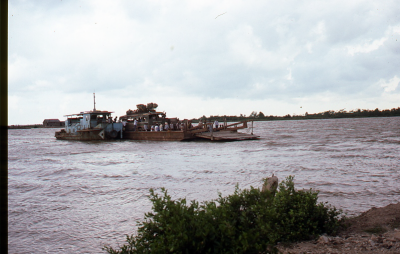 Veerpont in de Mekongdelta in Vietnam, 1987.