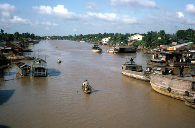 Schepen en bootjes in de Mekongdelta in Vietnam, 1987.