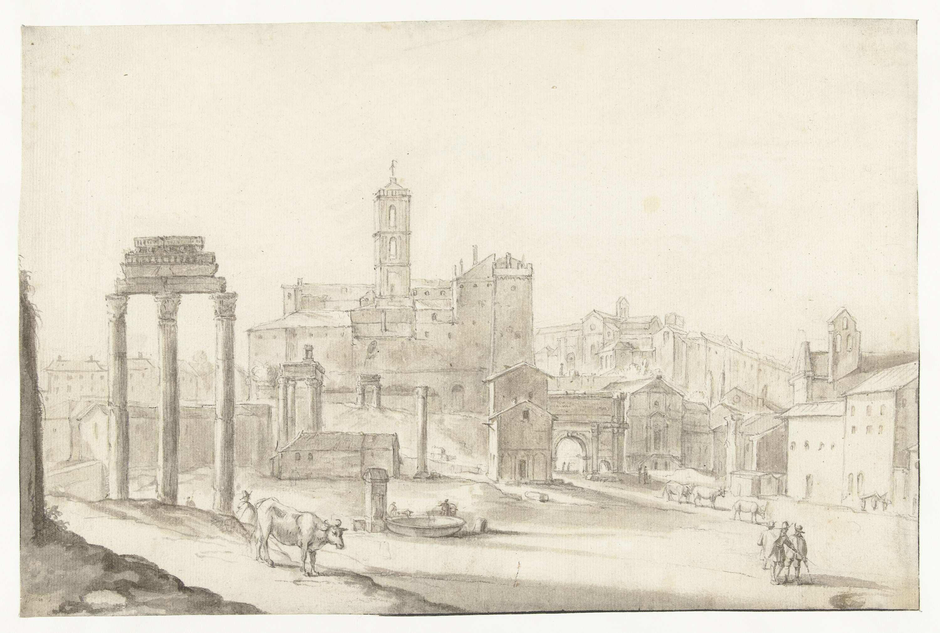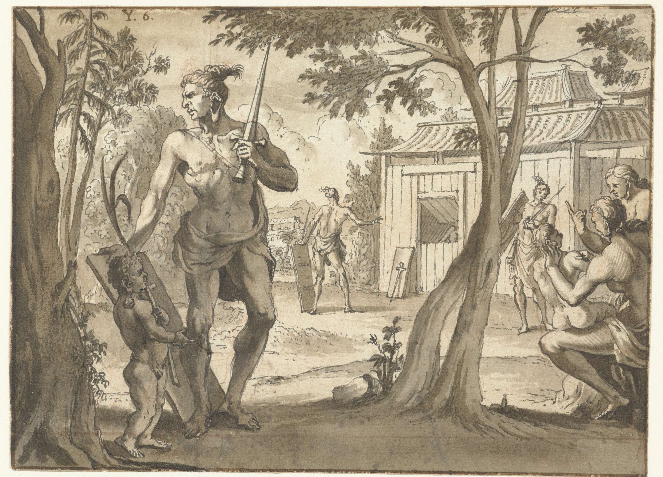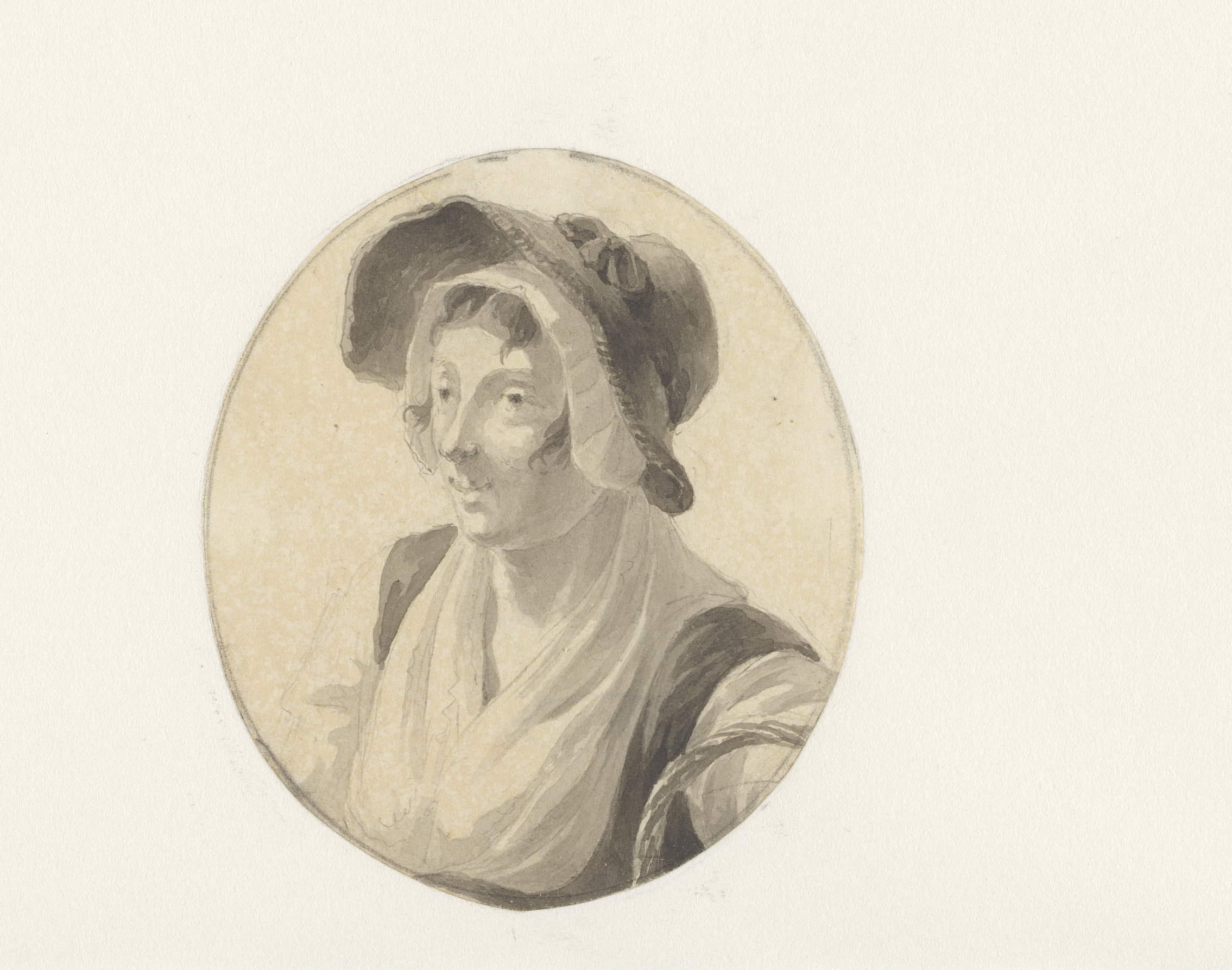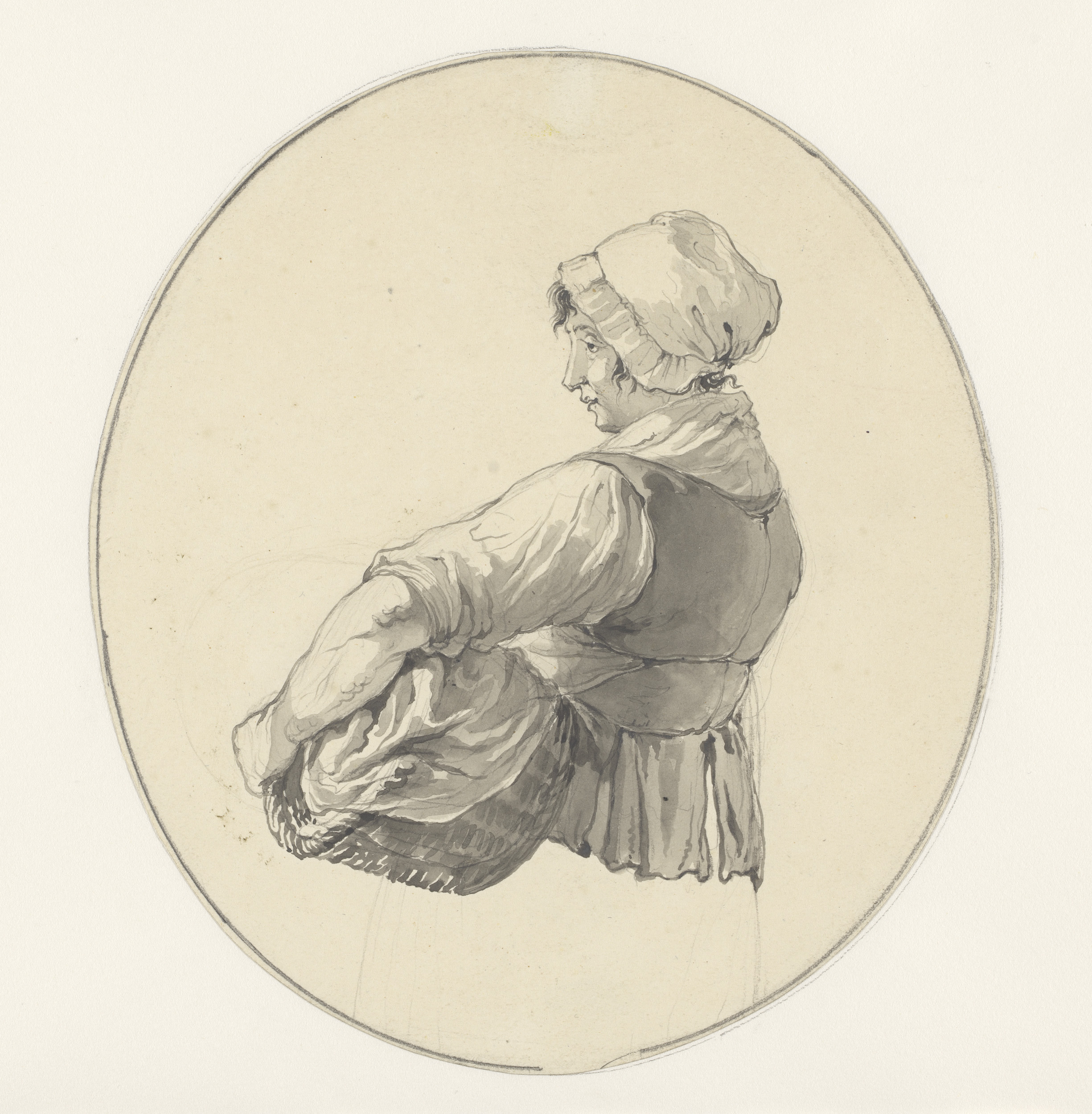 Vrouw op klompen met mand, driekwart van achteren ge...