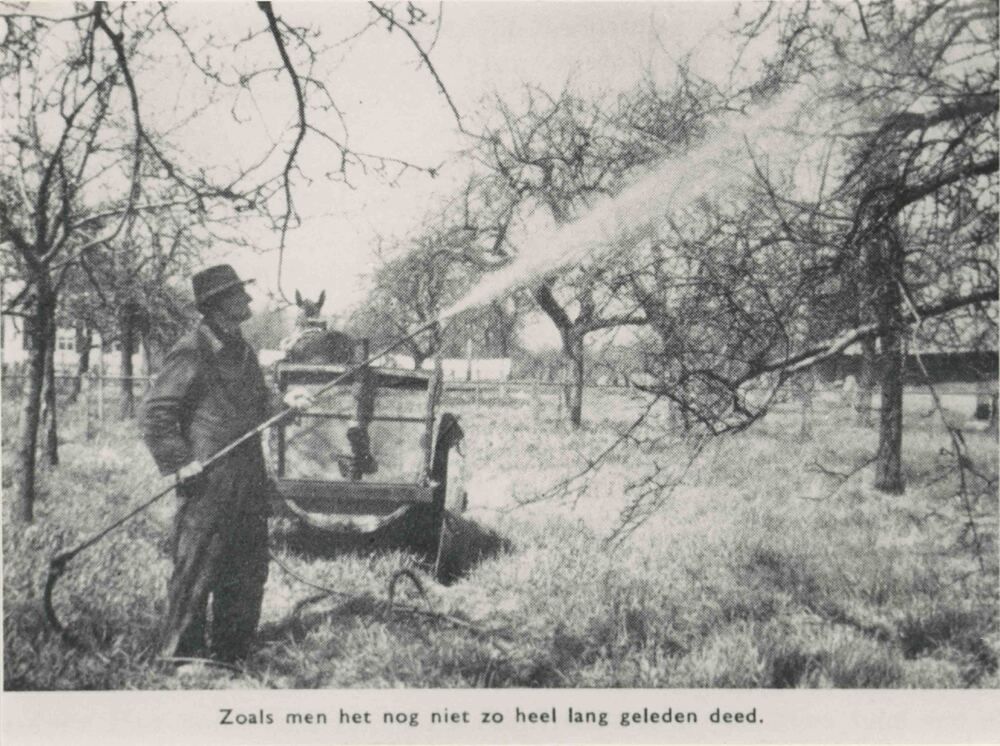 Foto, voorstellende het spuiten van de boomgaard, be...