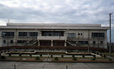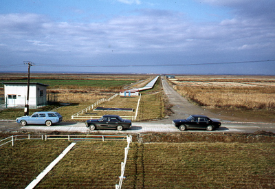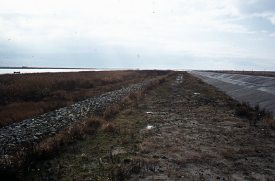 Gebouwen langs de ringdijk van de polder Hachirogata...