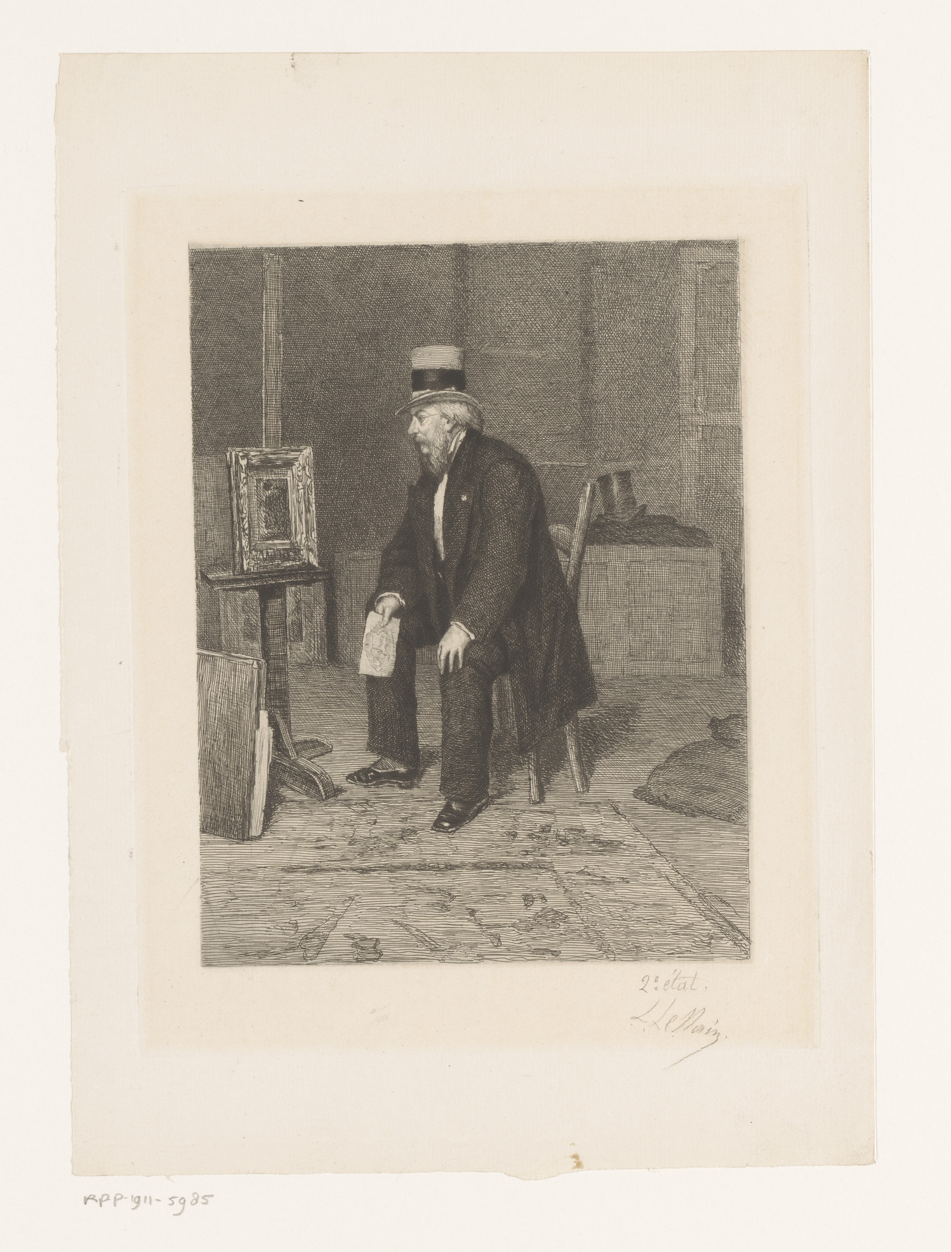 Interieur met een man met hoge hoed die een schilder...