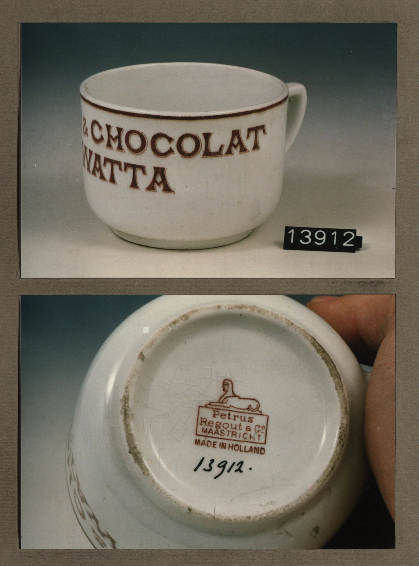Kop met opschrift, model U met decor Kwatta cacao &