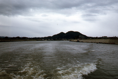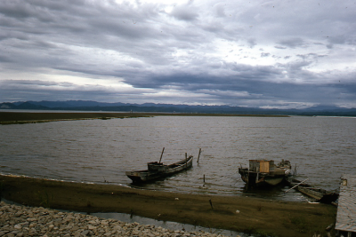 Bootjes bij de ringdijk van de polder Hachirogata in...