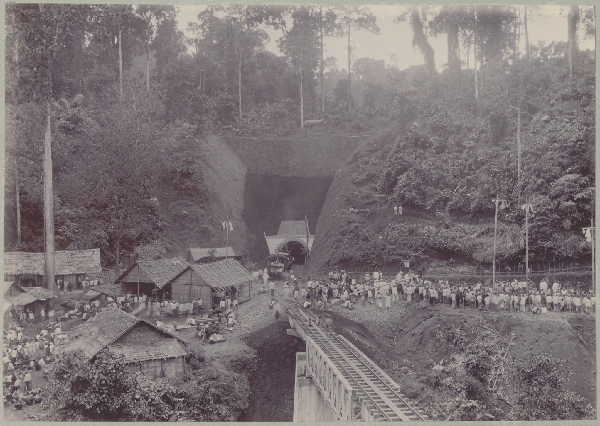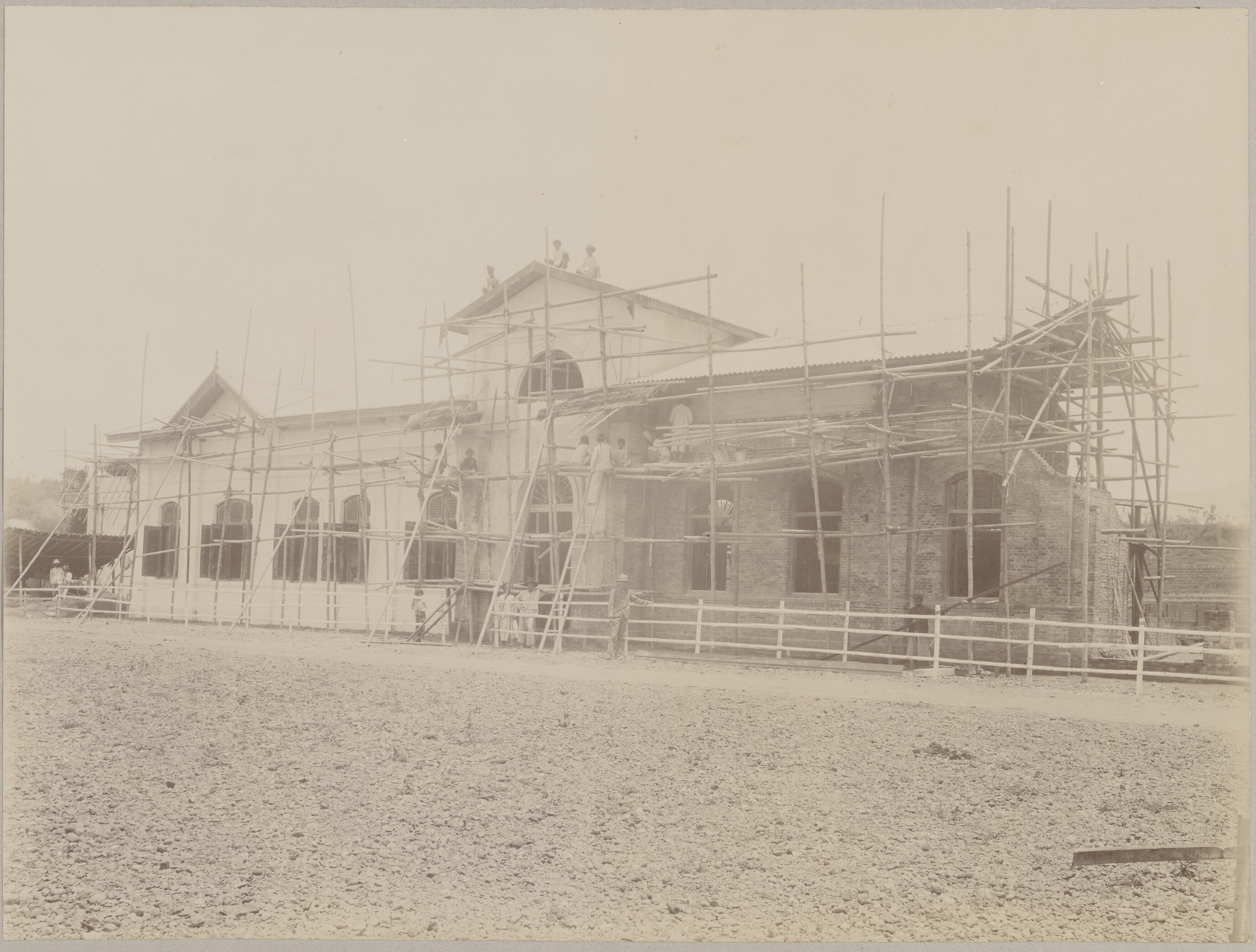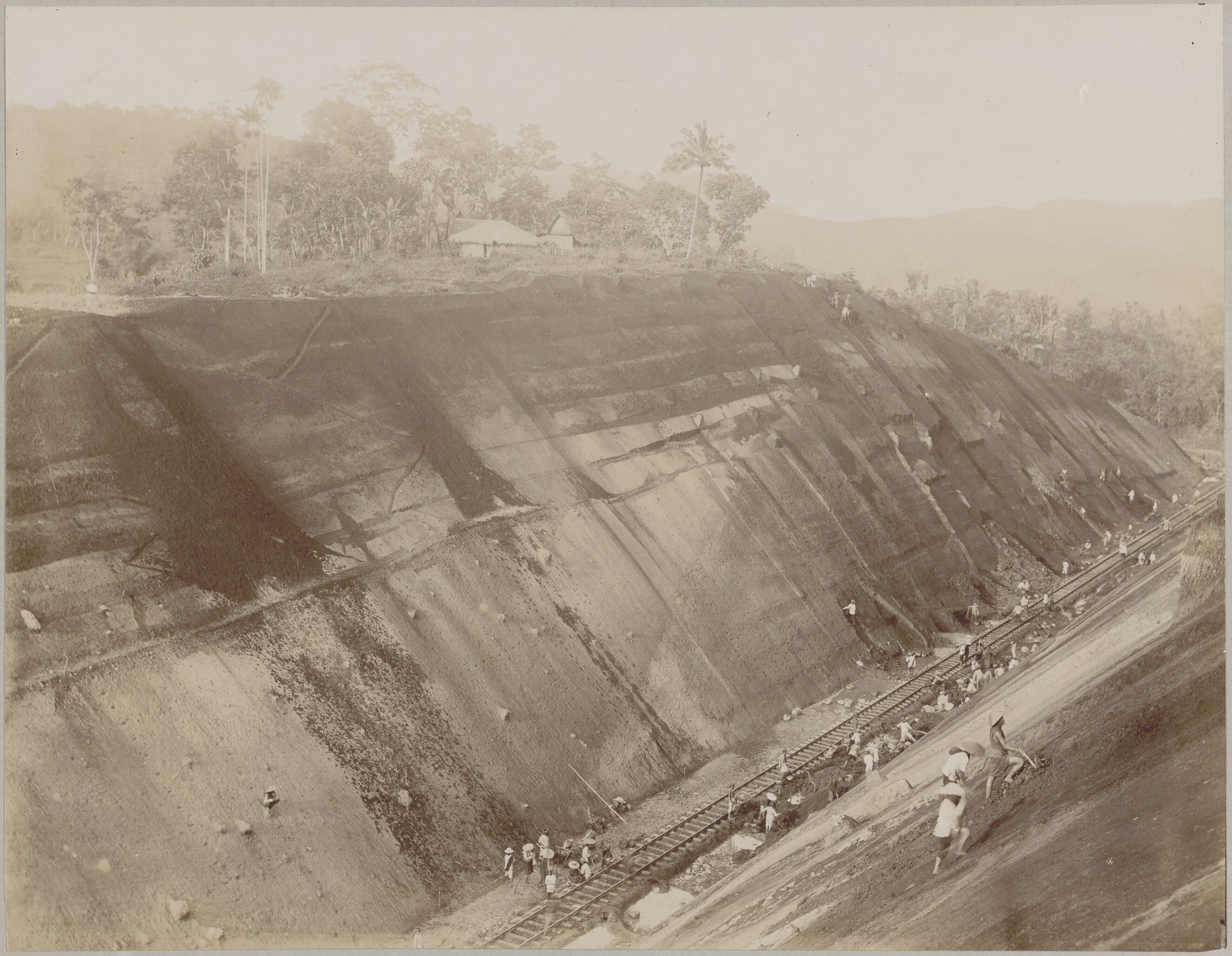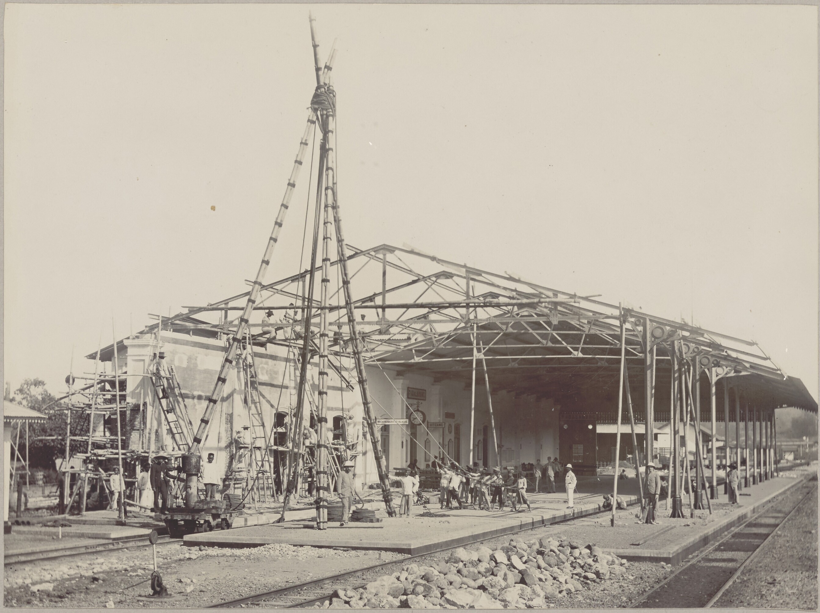 Spoorbrug in aanbouw over de rivier bij Tjisomang