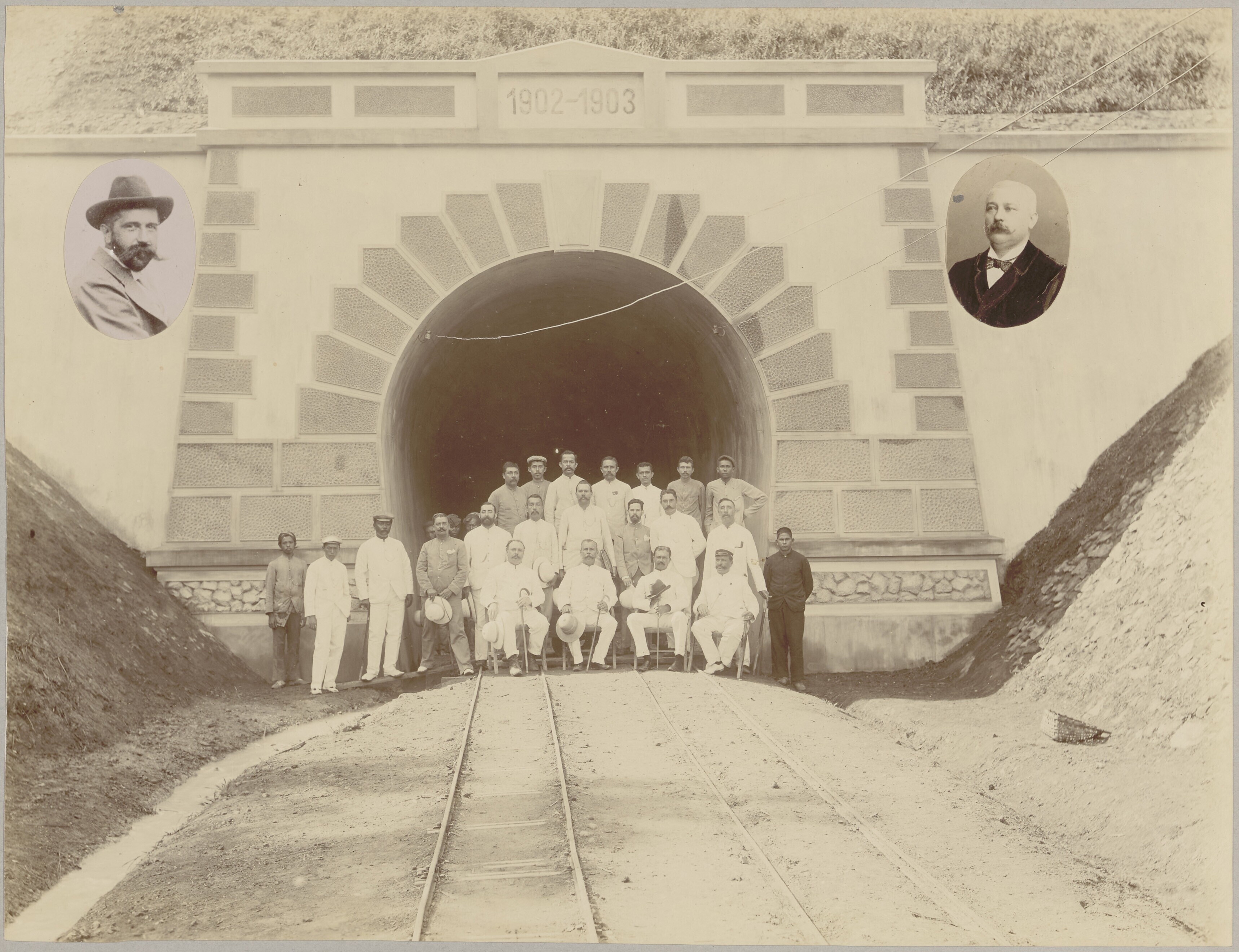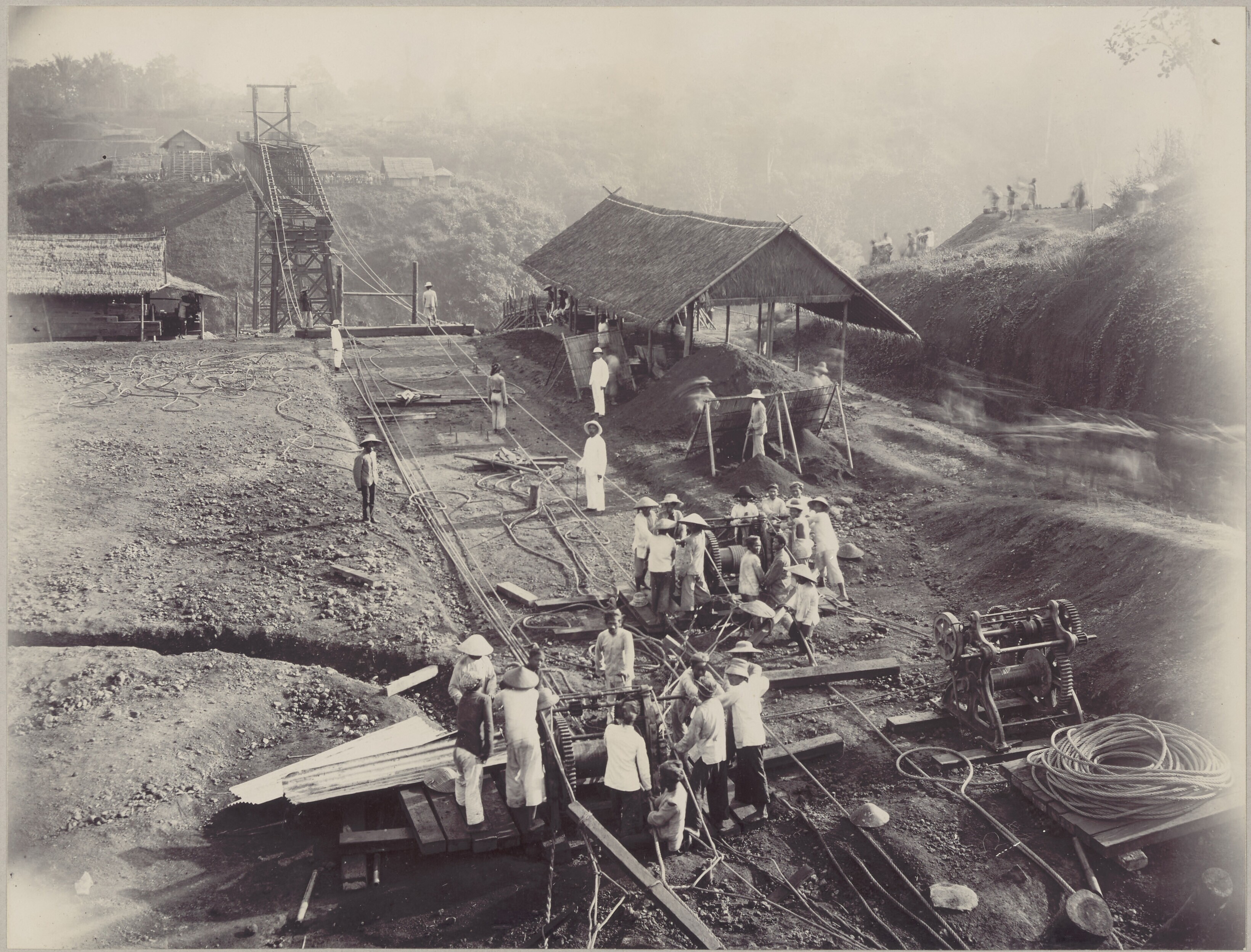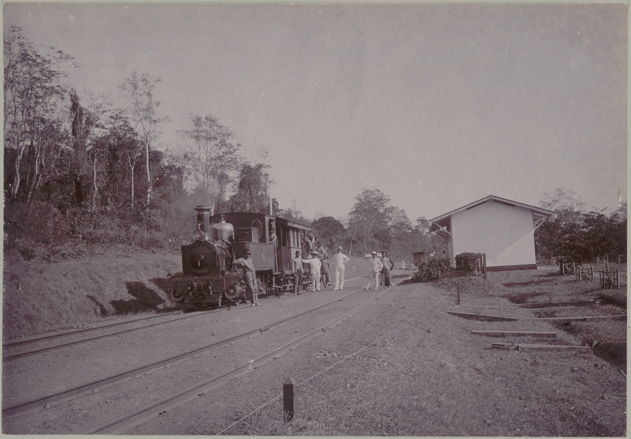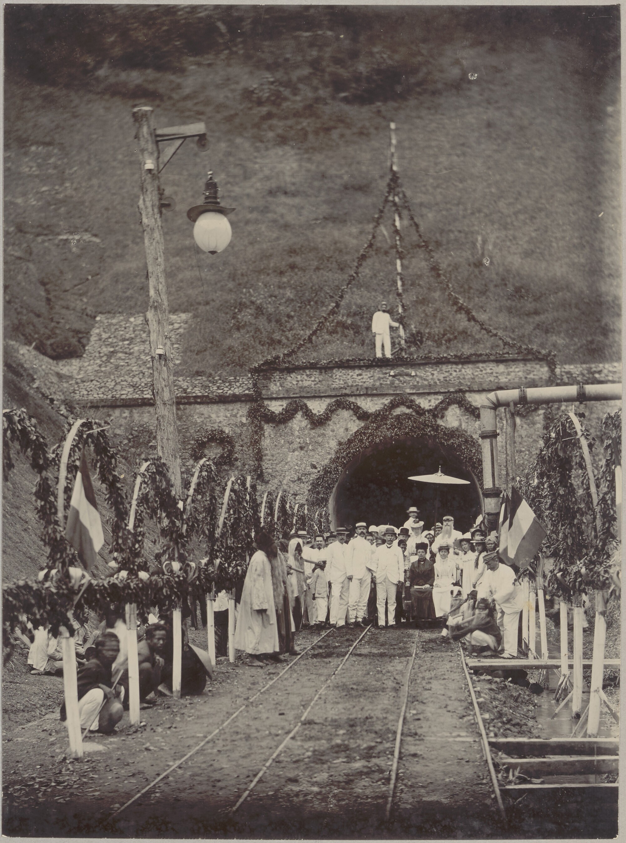 Spoorbrug in aanbouw over de rivier bij Tjisomang