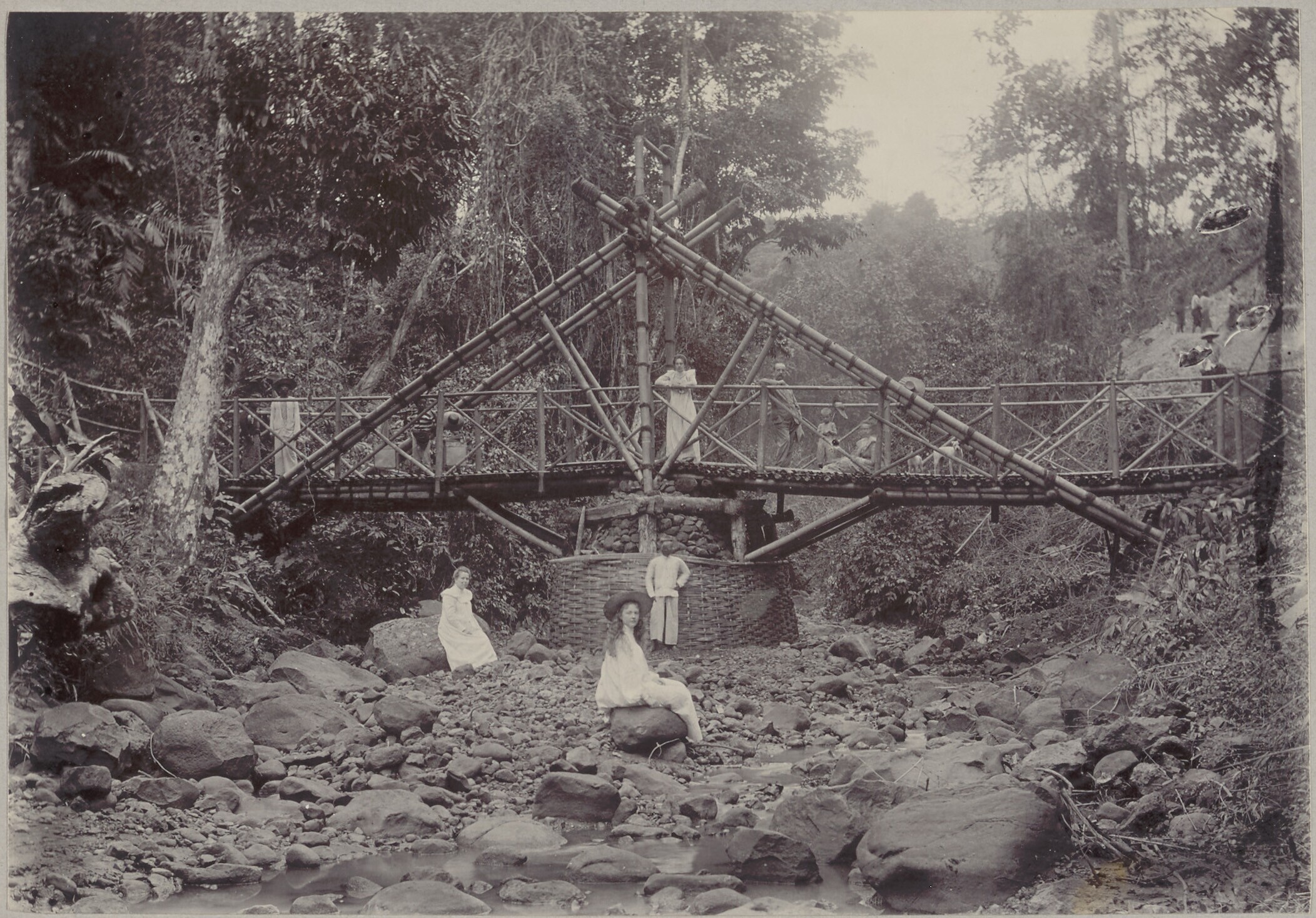 Een loopbrug van bamboe over de rivier Tjileuleuj
