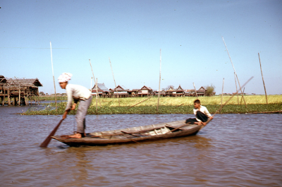 Mannen op een bootje op een rivier in Thailand. Op d...