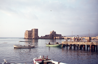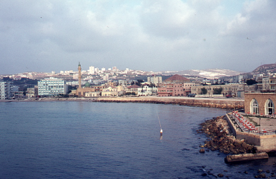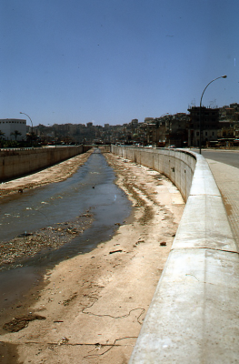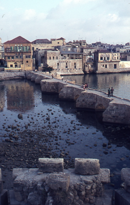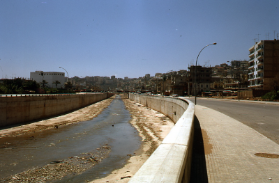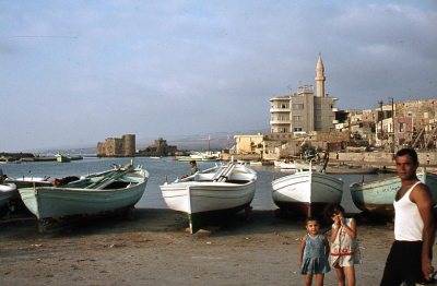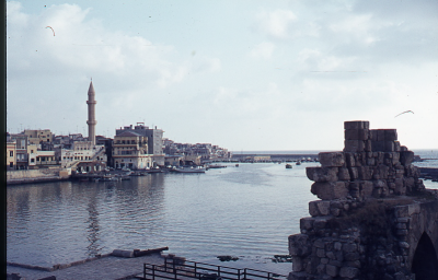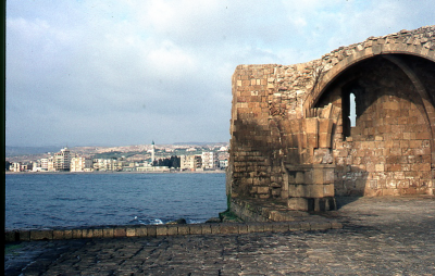 Stad aan de kust in Libanon. Op de voorgrond een kanon.