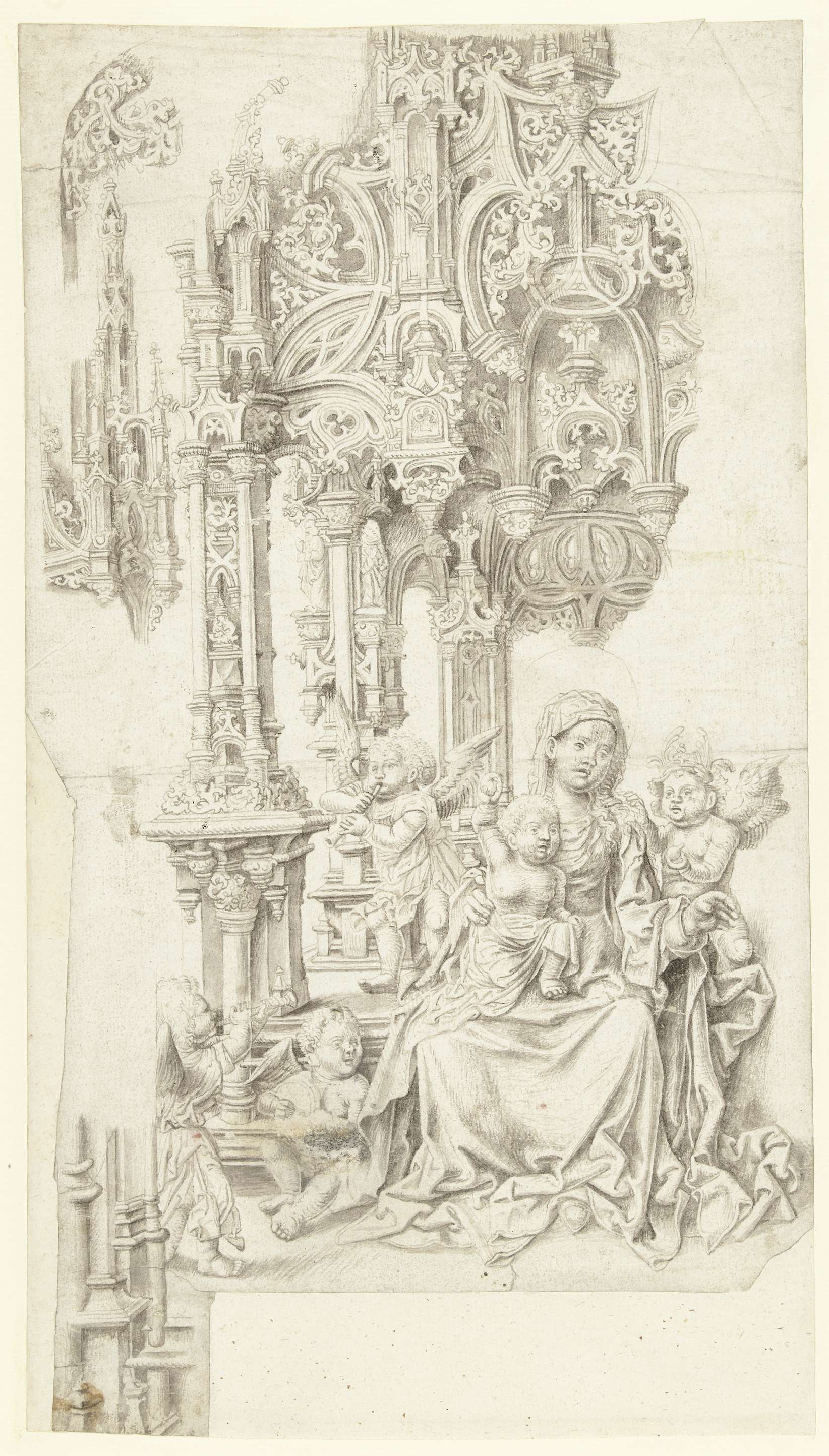 Maria met kind gezeten op een troon omringd door mus...
